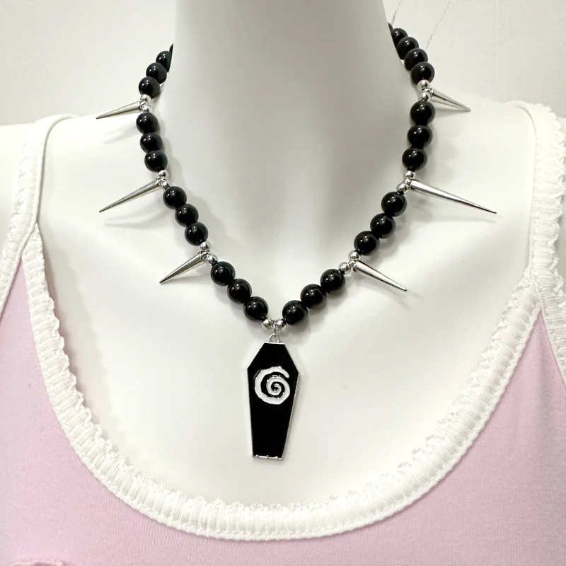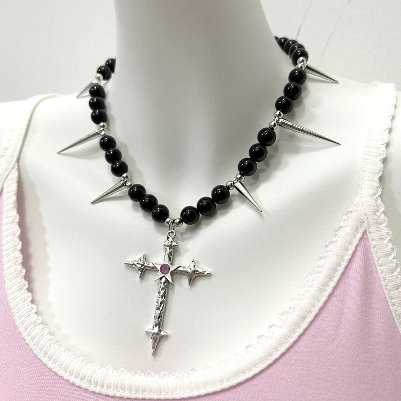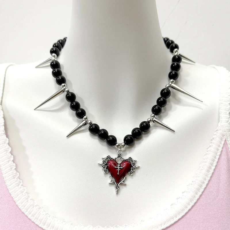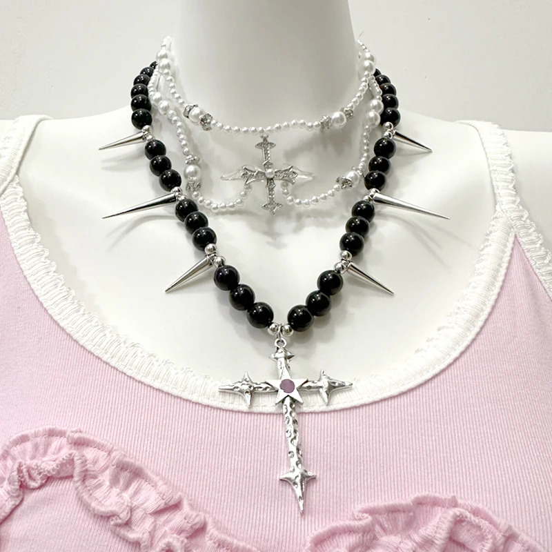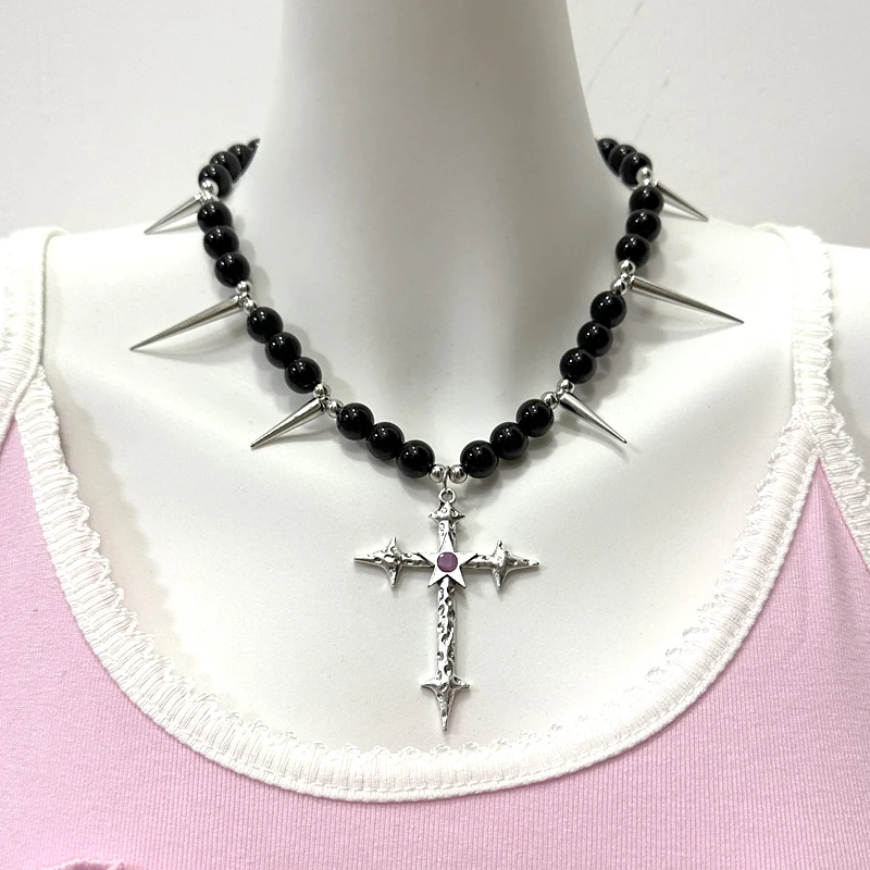 Gothic Jewelry Black Pearl Rivet Cross Pendant Necklace – Heart Rose Coffin Star Grunge Y2K Accessories