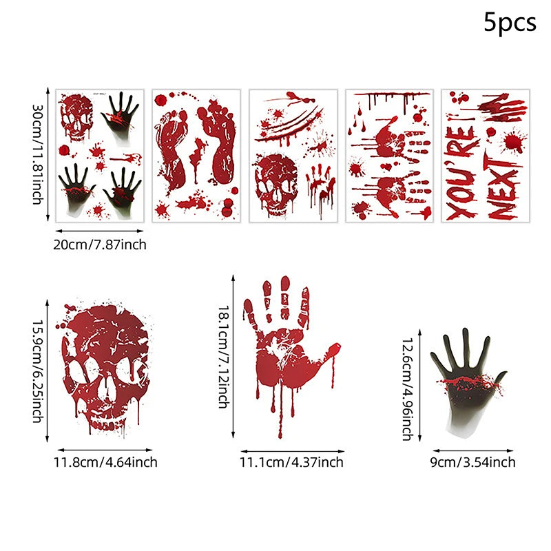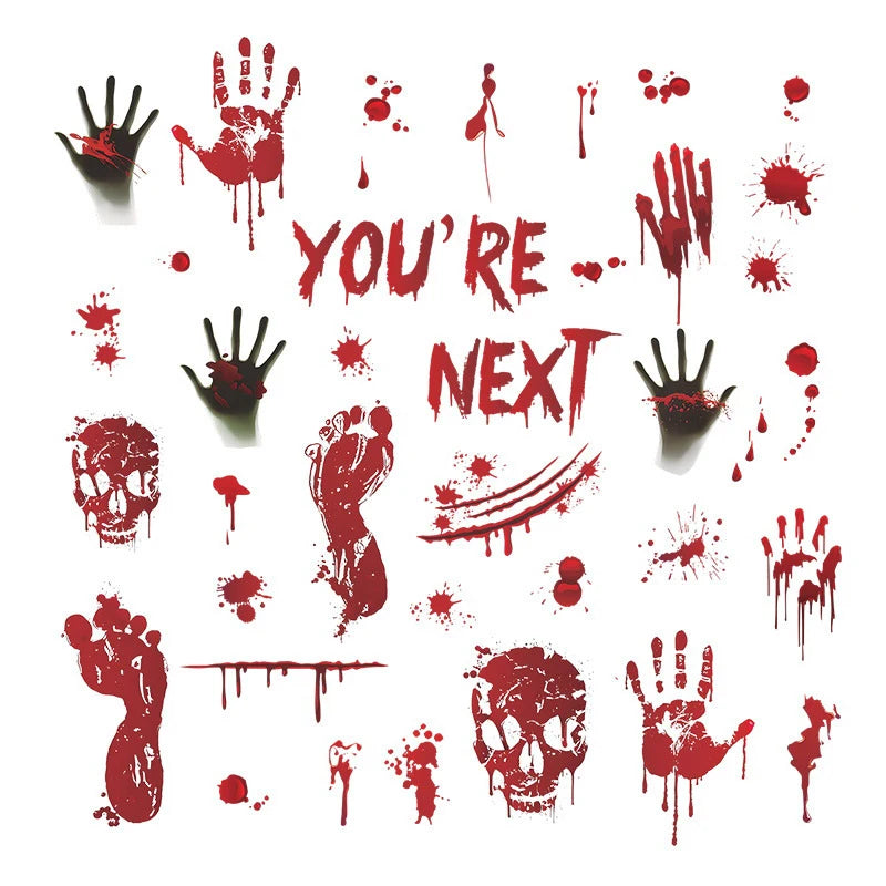 1PC Halloween Blood Handprint Skull Wall Sticker – PVC Horror Self-Adhesive Decoration for Bedroom Background
