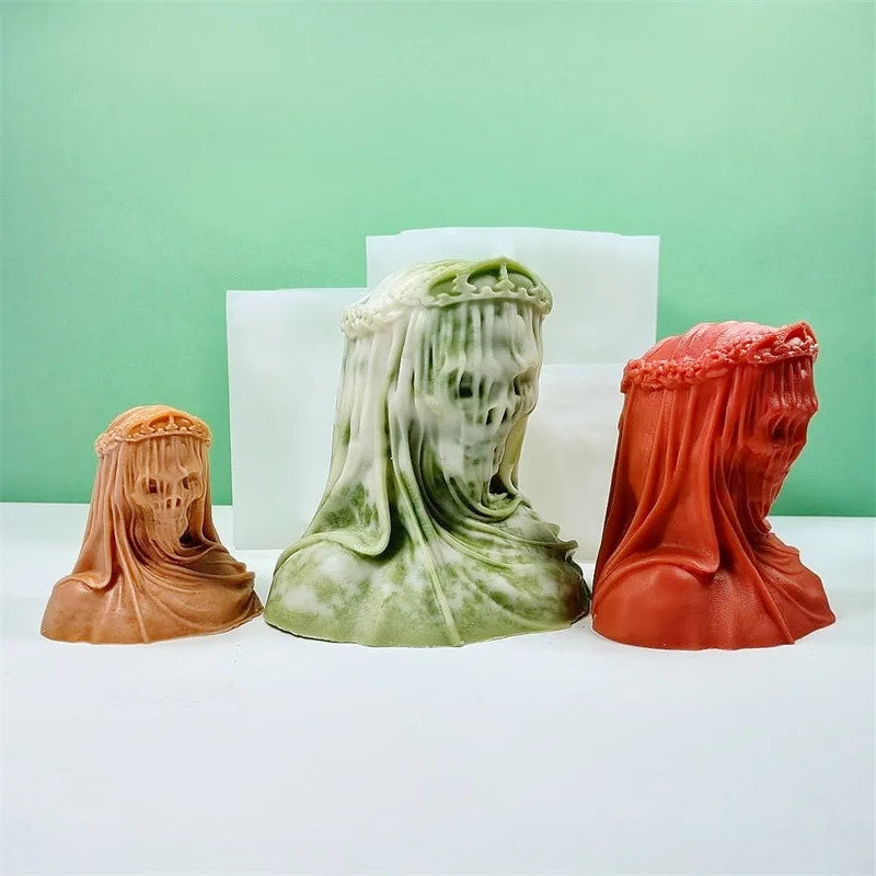 Craft your own spooky masterpieces with this 3D Masked Veil Skull Silicone Mold — perfect for making Halloween candles, resin figures, or gothic bust statues that wow as decor or handmade gifts.