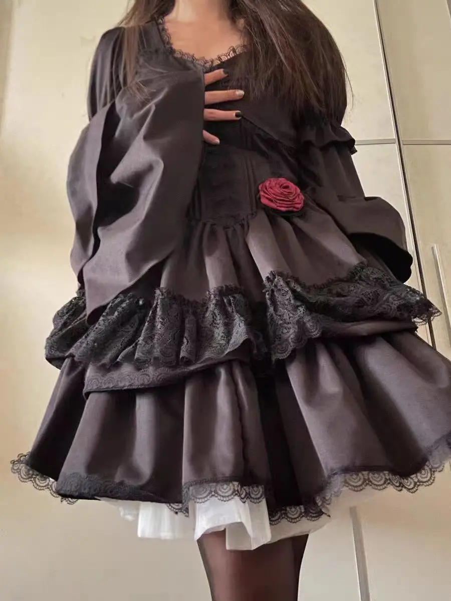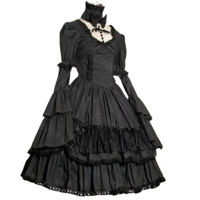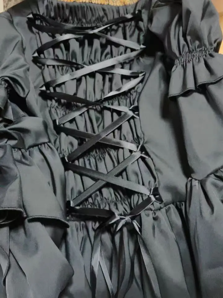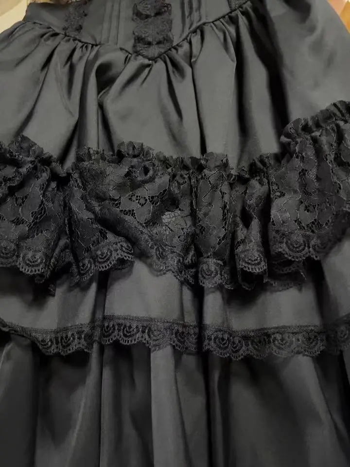 Autumn Spring Long Puff Flare Sleeve Gothic Vintage Lace Lolita Dress – Solid Black Ball Gown with Two-Way Wearing Customization