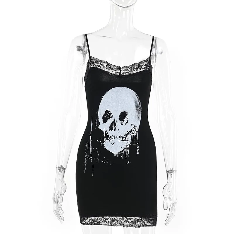 Goth Dark Streetwear Anime Skull Print Mini Dress – Fairy Lace Strap Bodycon Club Outfit for Women