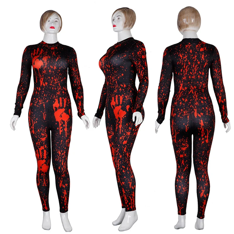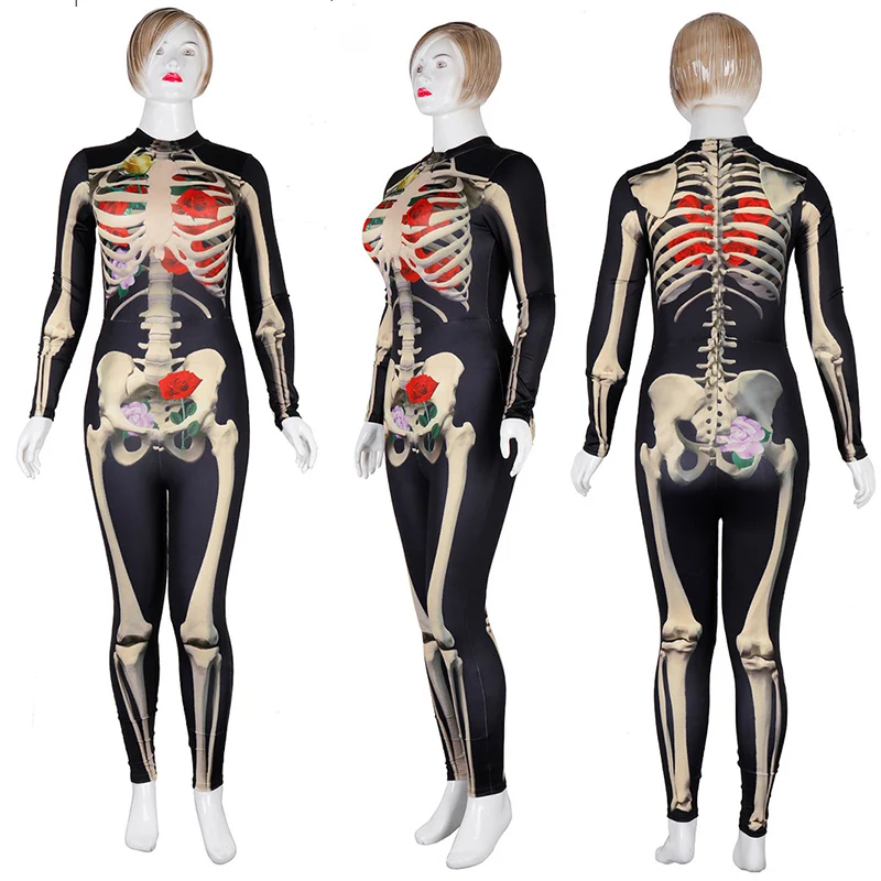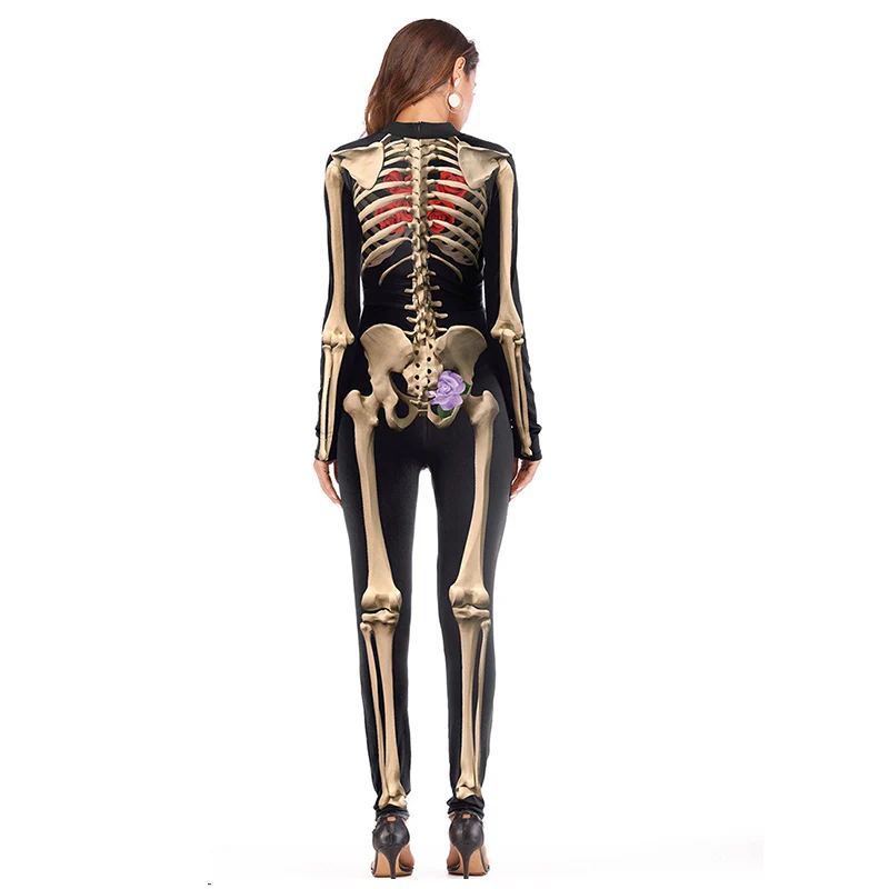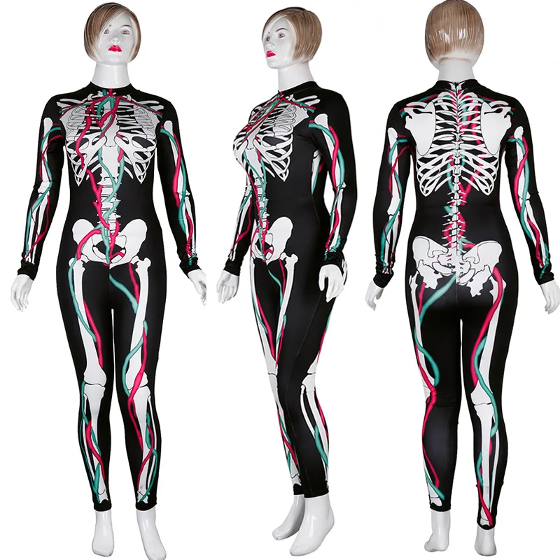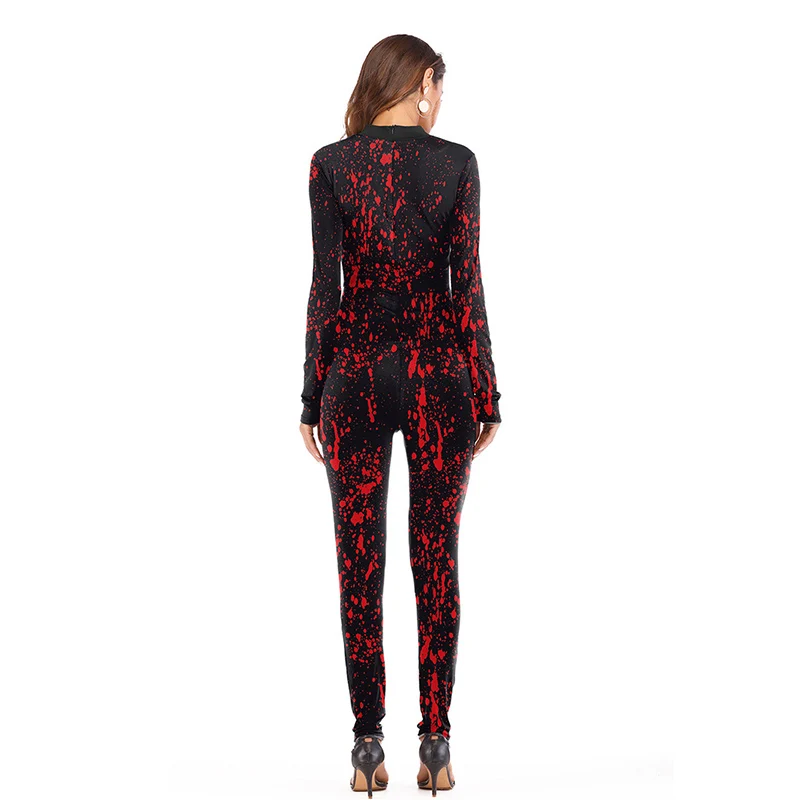 Halloween Costume Carnival Party Scary Skeleton Bone Bodysuit Jumpsuit – Adult Women Horror Bloody Catsuit