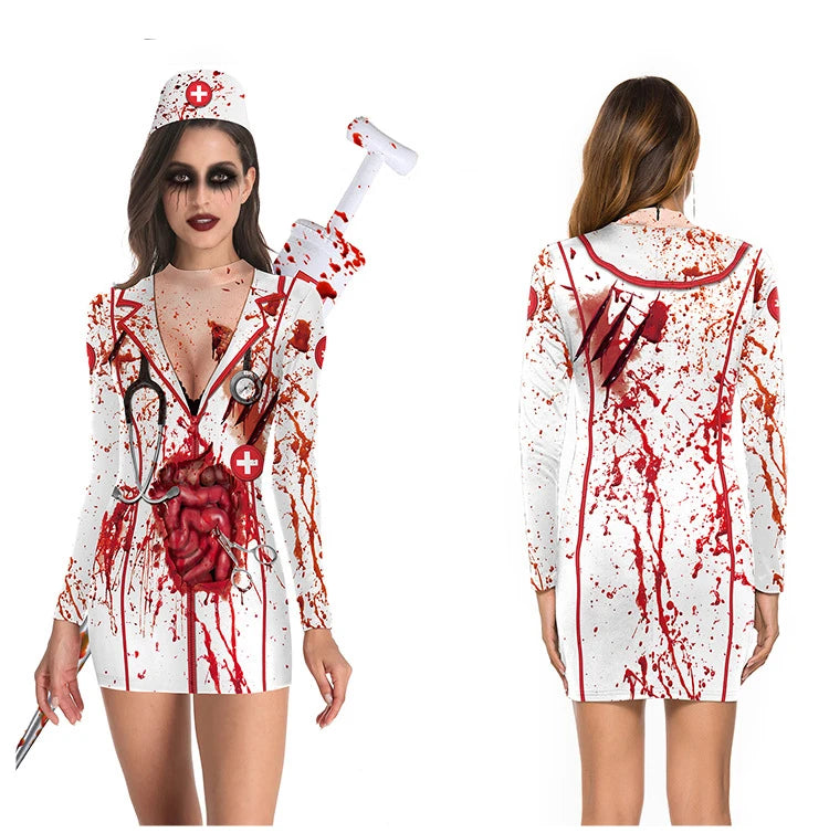Striking blood nurse uniform design with printed details for a horror effect