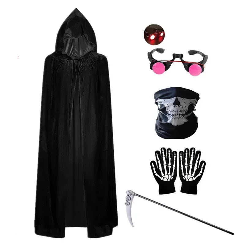 Make Halloween spooky and fun for kids with this Red Eyes Grim Reaper Costume — featuring a hooded cape, scary mask, gloves, and scythe props. Perfect for trick-or-treating, parties, or themed events.