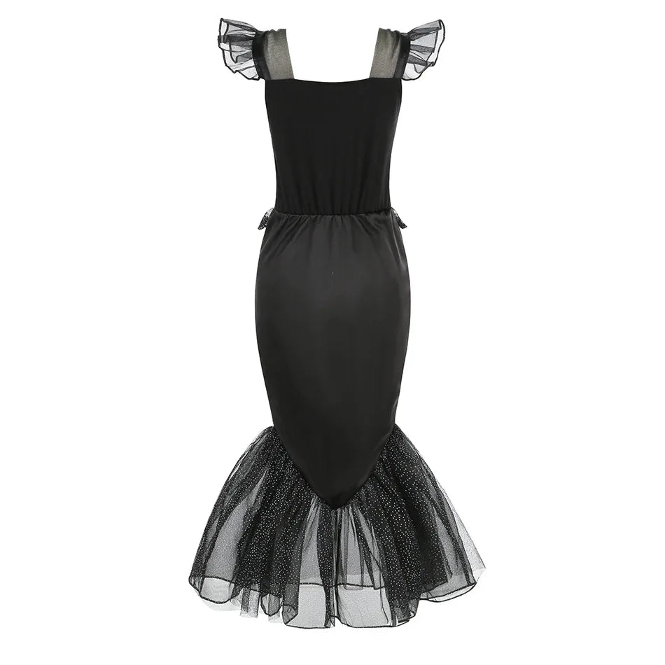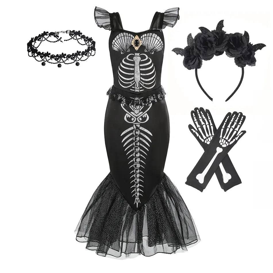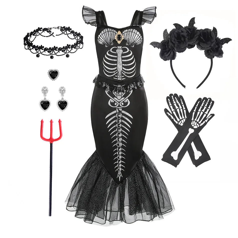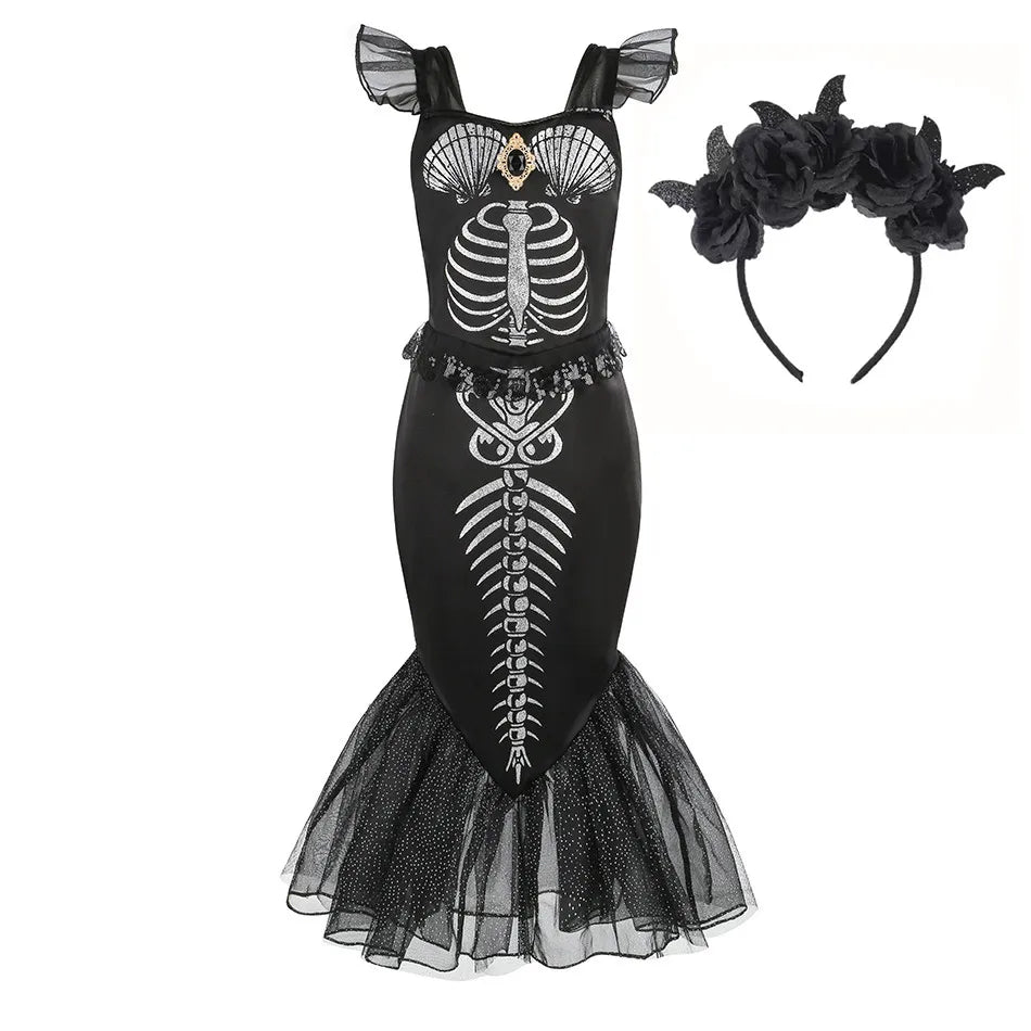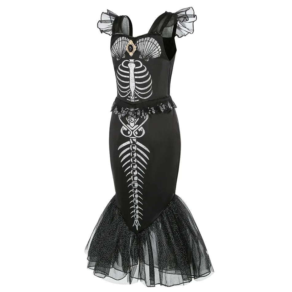 Horror Mermaid Skeleton Costume for Little Girls – Gothic Princess Trumpet Dress Black Ariel Siren Cosplay Frock