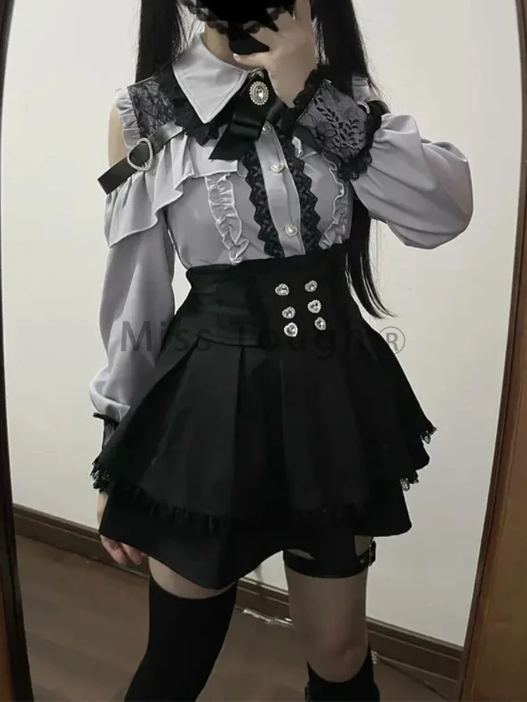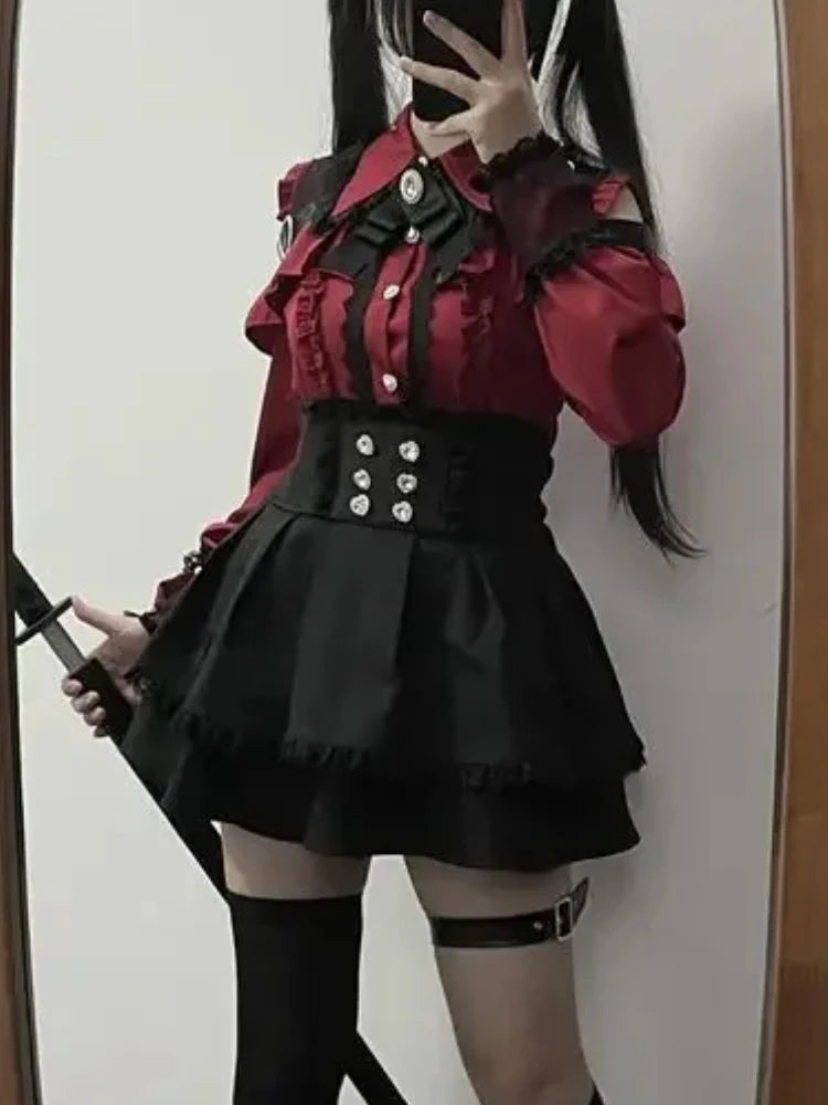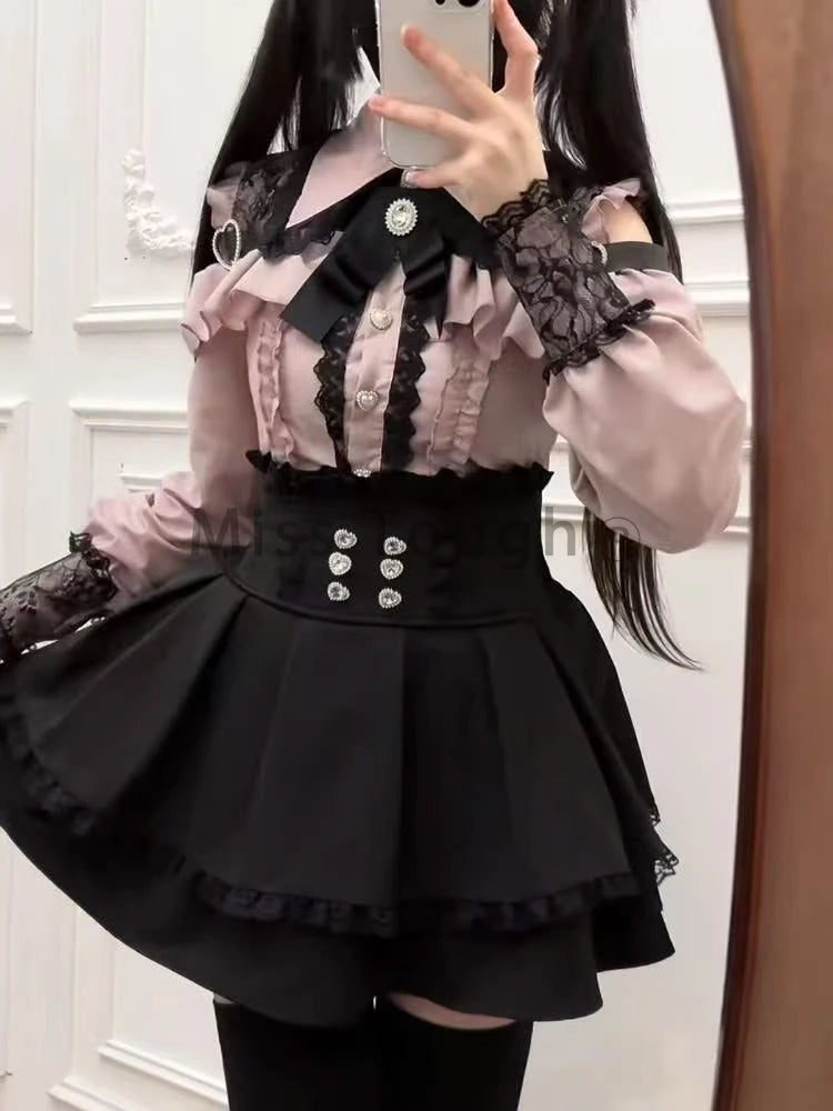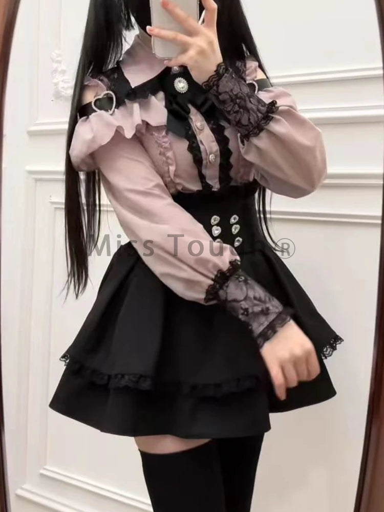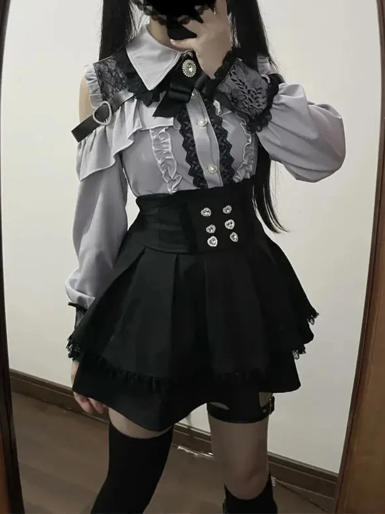 Capture vintage charm and modern edge with this Japanese Lolita Dark Academia 2-Piece Set — featuring a stylish lapel neck patchwork shirt paired with a trendy Y2K-inspired high waist skirt. Perfect for Harajuku fashion lovers and retro aesthetic enthusiasts.