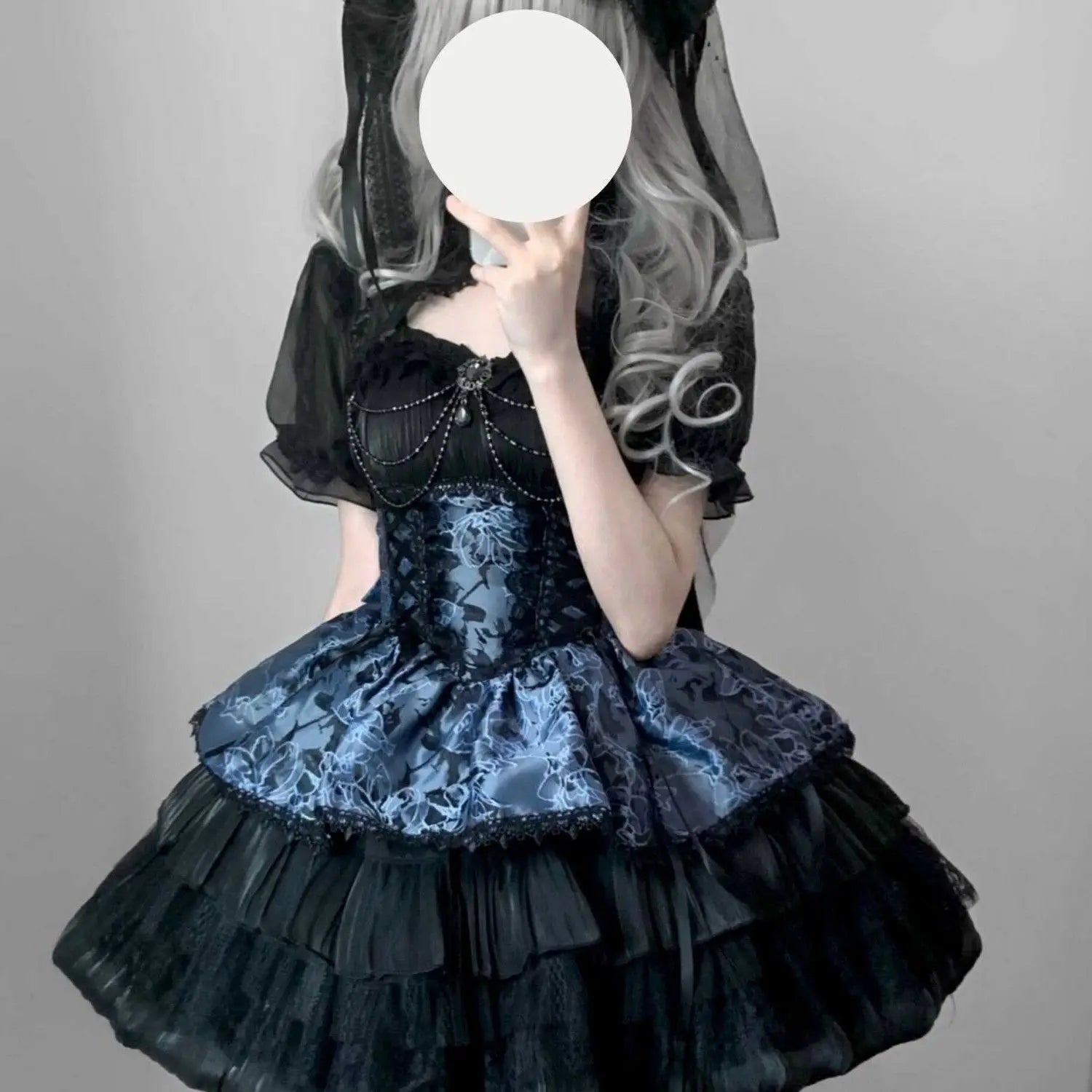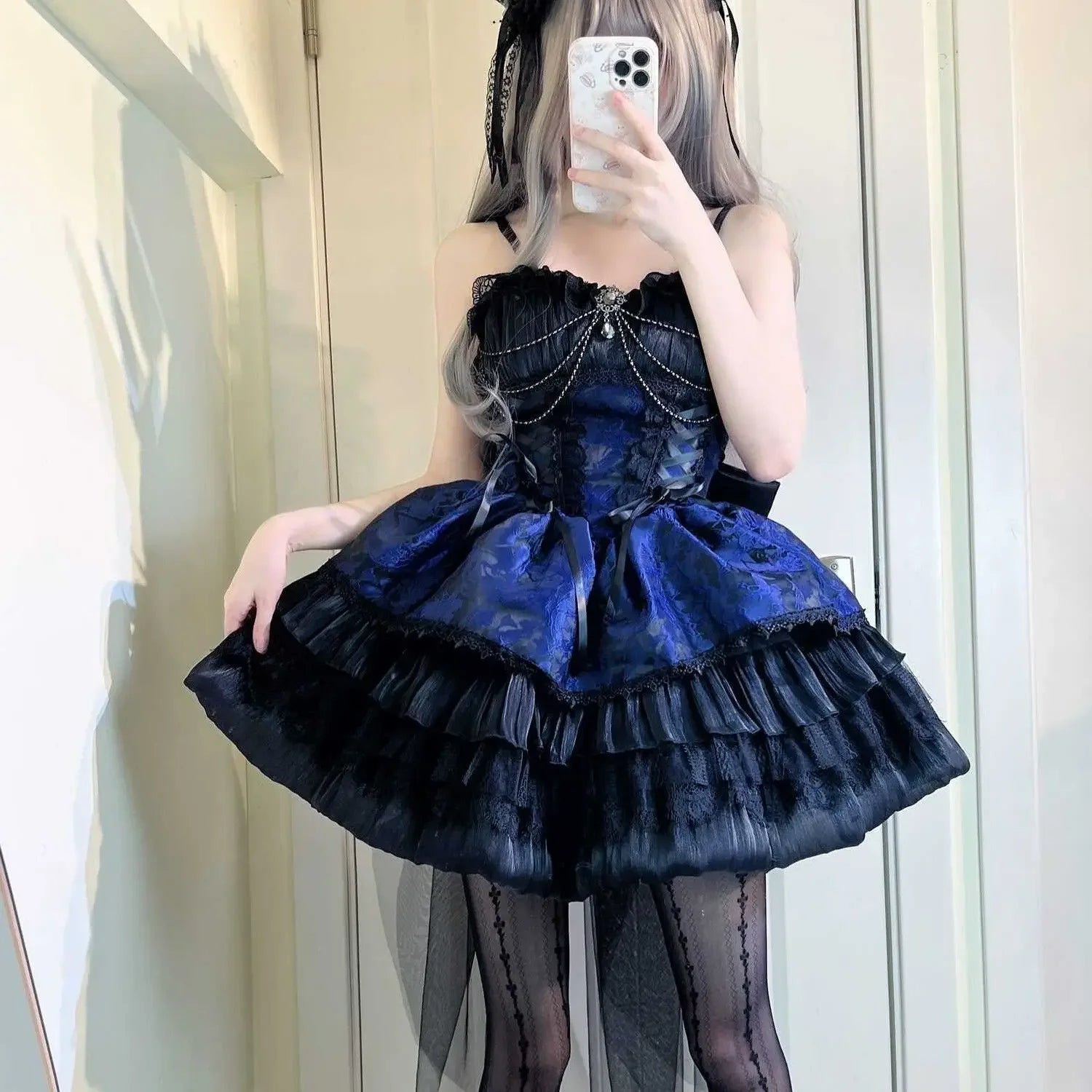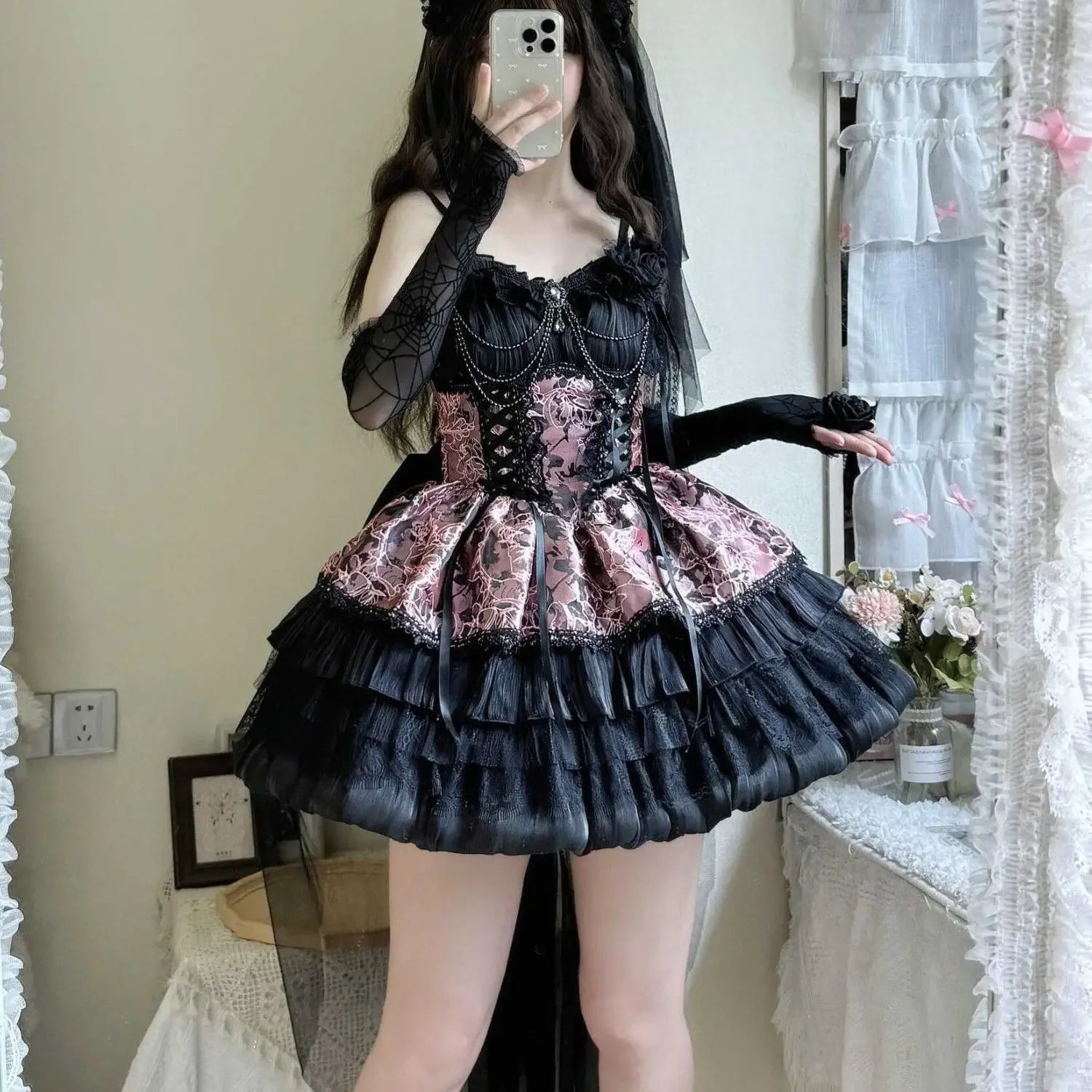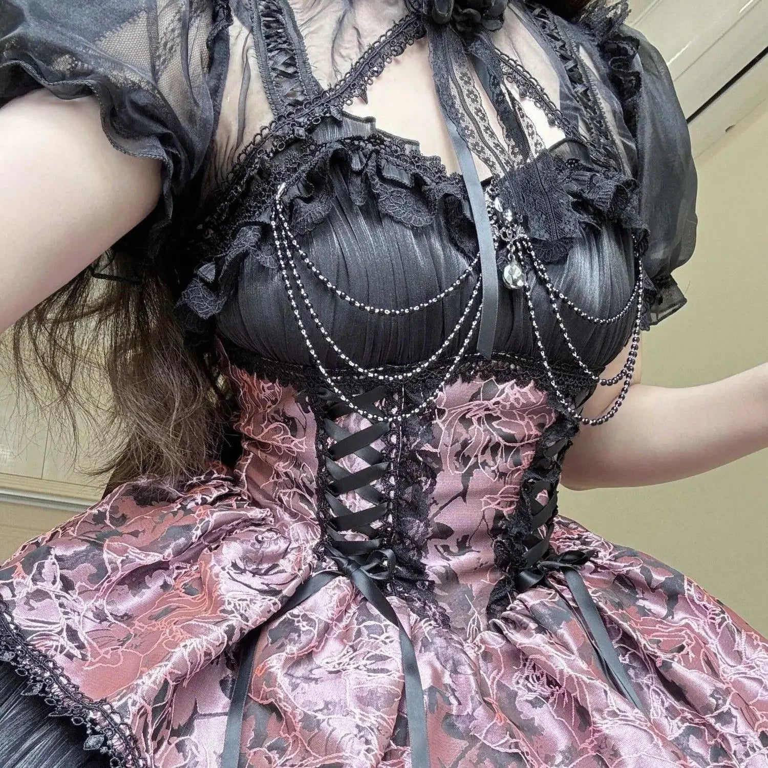 Blend Victorian elegance with Harajuku punk flair in the MAGOGO Japanese Sweet Lolita JSK Dress — a lace-trimmed, Y2K-inspired princess dress perfect for gothic parties, cosplay, and standout street style.