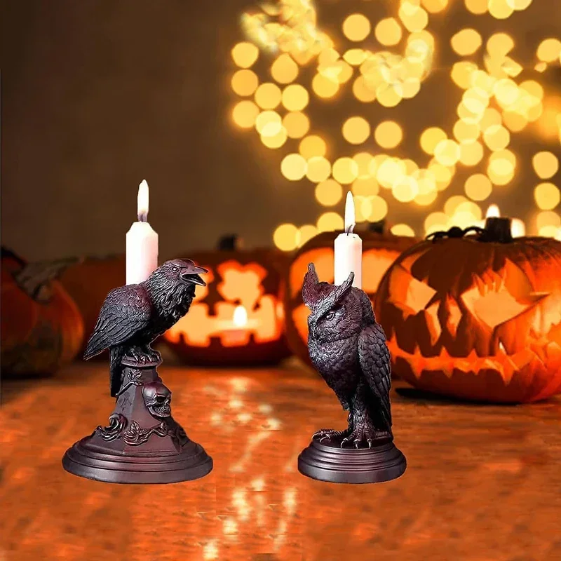 Gothic Crow Candle Holder – Retro Black Owl Candlestick Sculpture for Halloween & Home Décor