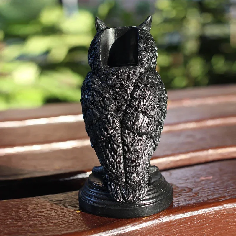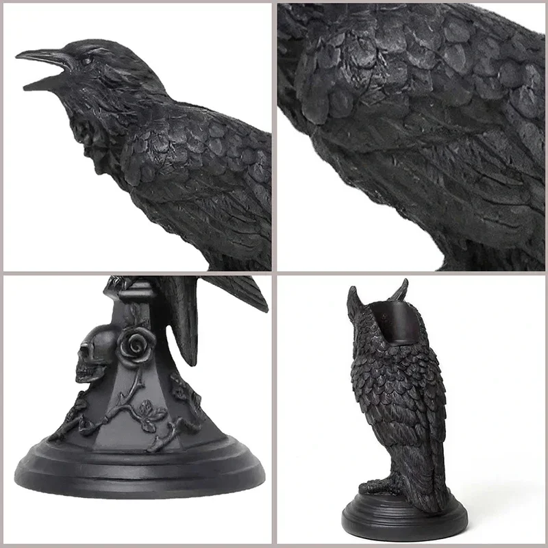 Unique design featuring a crow perched on a gothic-style owl or pedestal