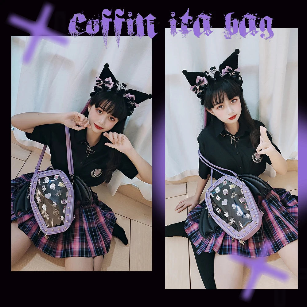Show off your dark aesthetic in style with this Gothic Punk Coffin-Shaped Ita Bag — a unique clear backpack and handbag combo perfect for cosplay, Lolita fashion, or showcasing your favorite pins and charms.