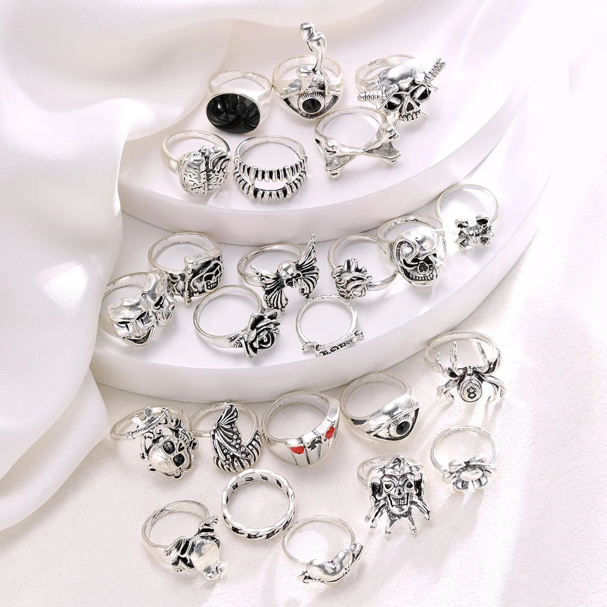 24Pcs/Set Punk Gothic Rings – Silver Skeleton, Spider, Poker, Joker, Eyes & Heart Designs for Men