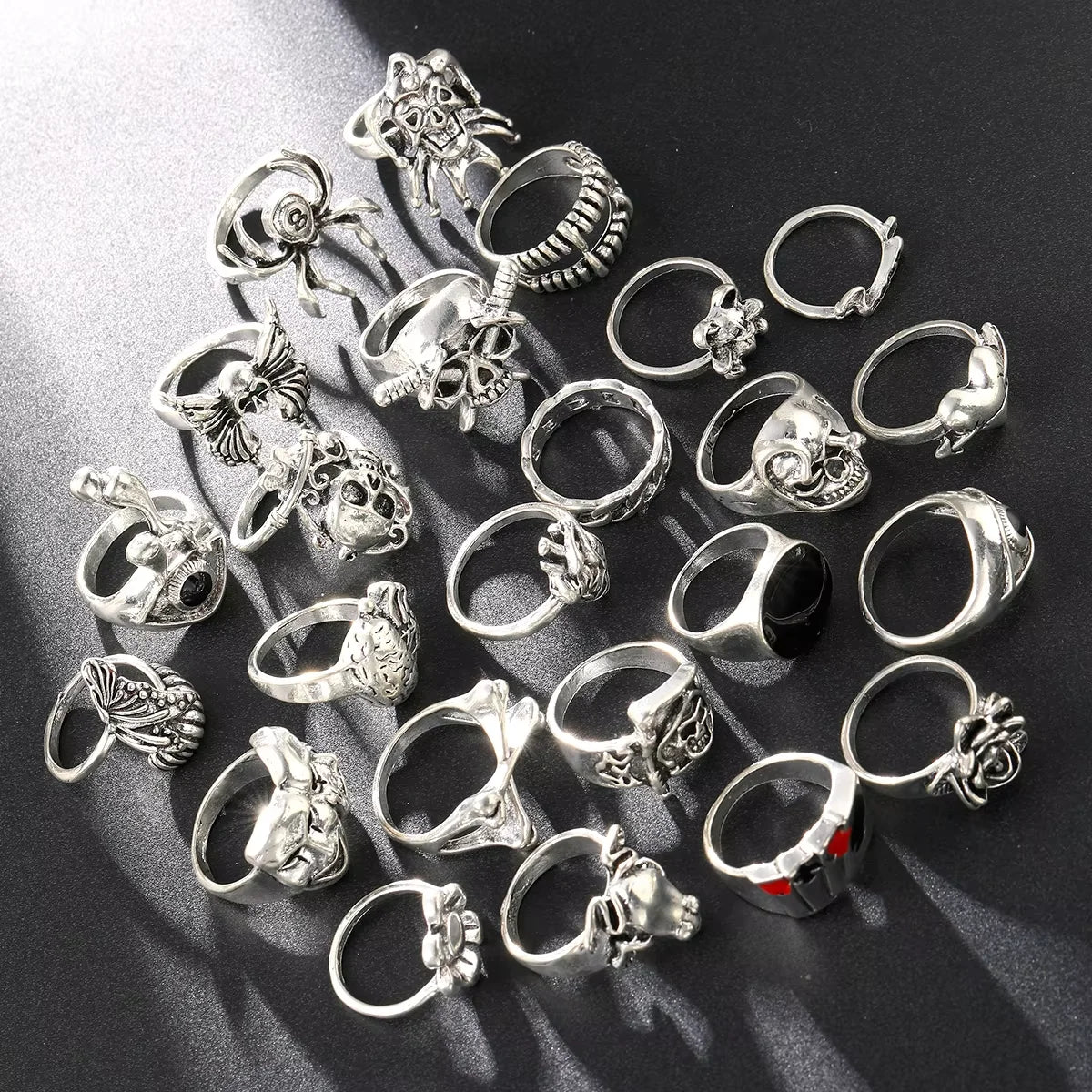 Upgrade your accessory game with this 24-piece Punk Gothic Ring Set — featuring silver-colored skeletons, spiders, poker symbols, jokers, eyes, and hearts, perfect for men who love bold hip hop and gothic fashion jewelry.