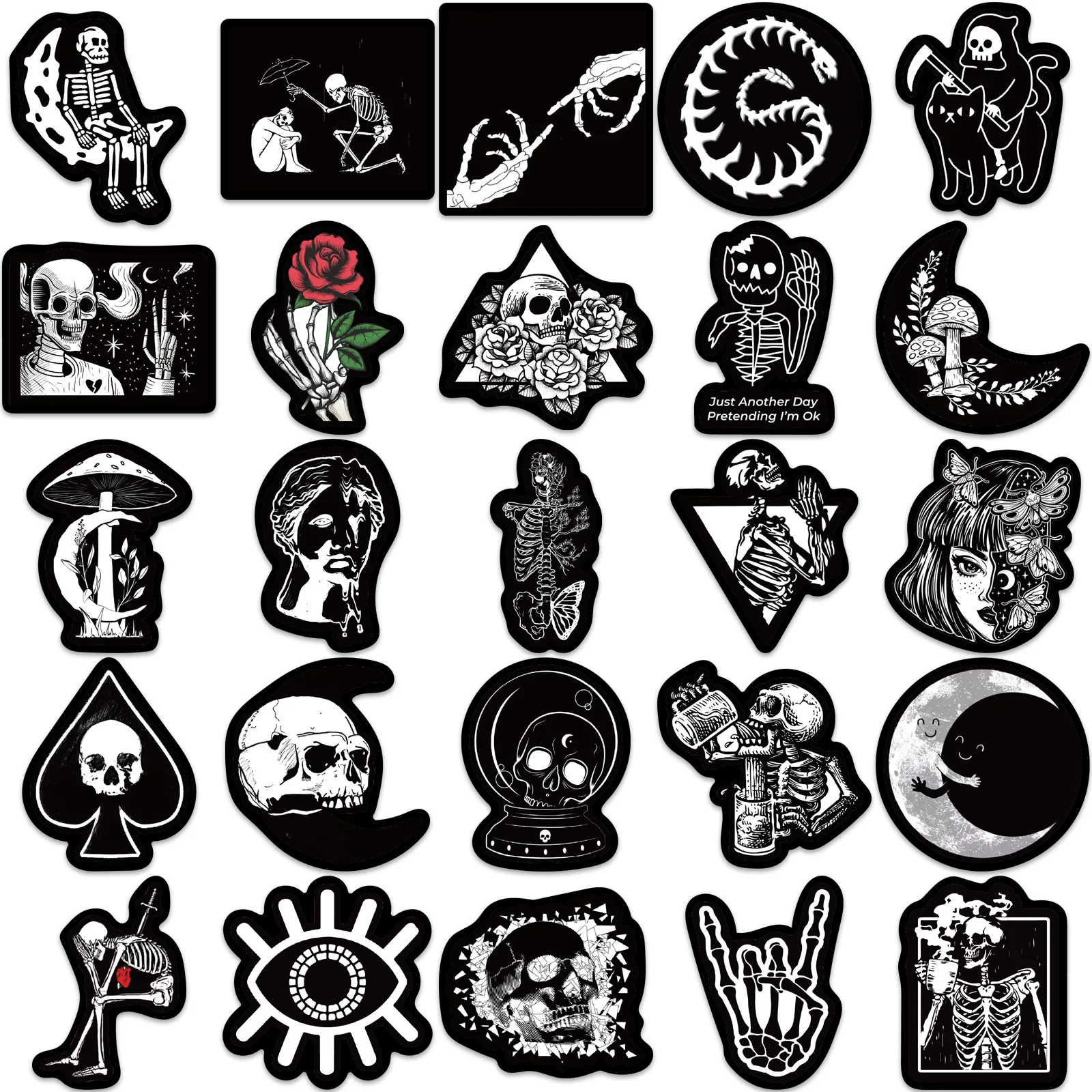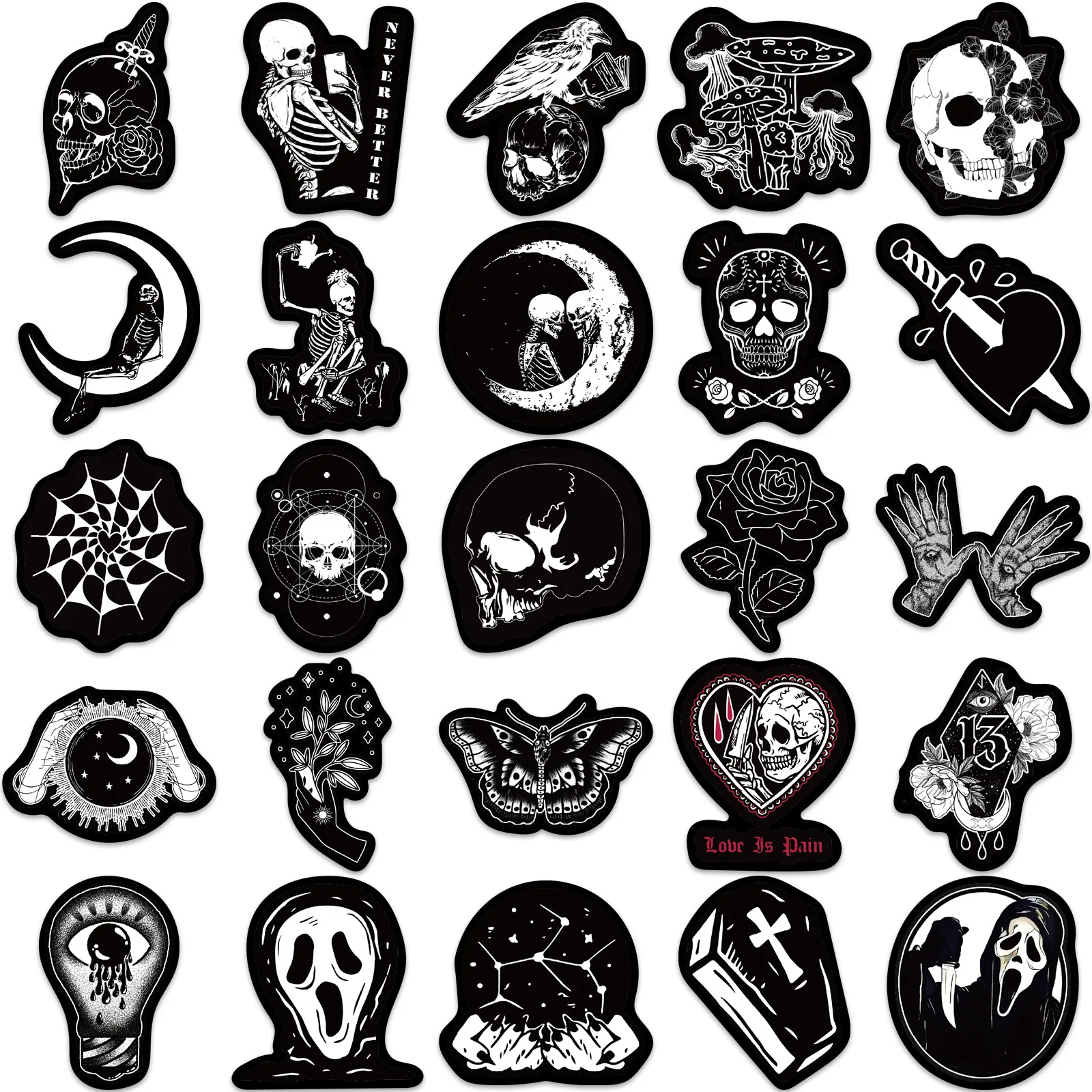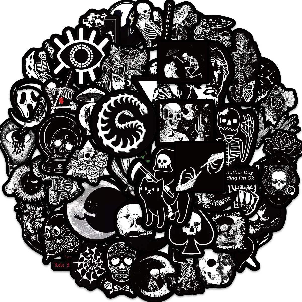 50Pcs Black & White Gothic Graffiti Stickers – Skull DIY Decals for Motorcycle, Laptop, Phone & More