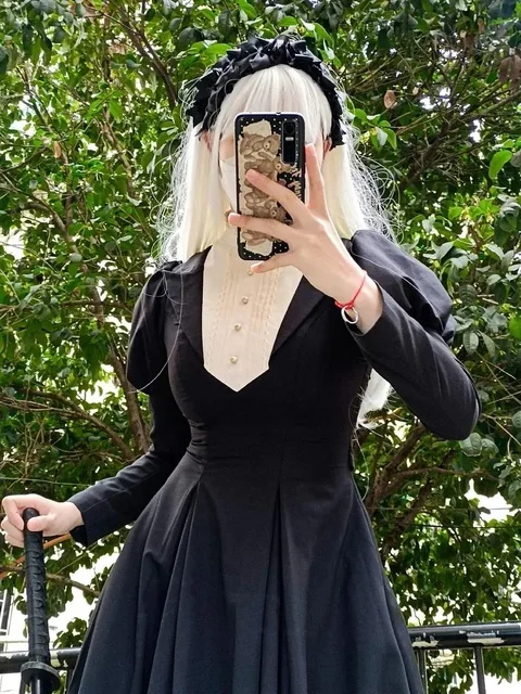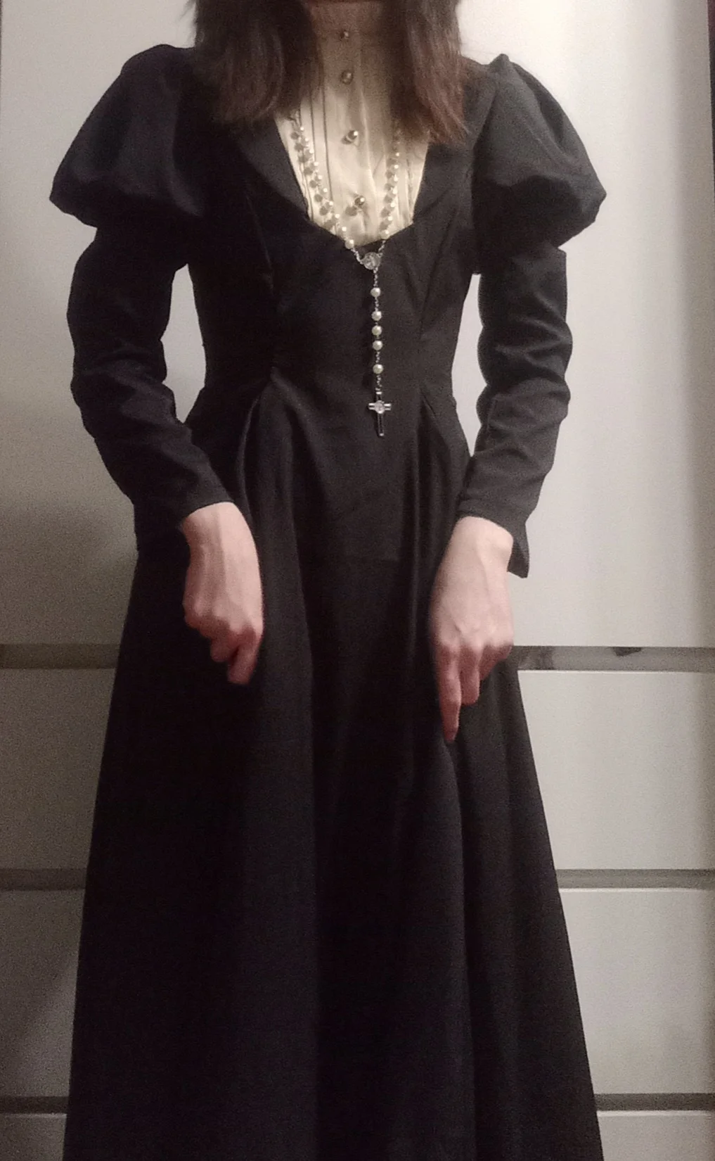 The dress is incredibly cool, the fabric is good, the stitching quality is excellent (the only thing is that everything is stitched with black thread, even the white insert might be slightly visible). It fits perfectly on the figure thanks to two ribbons that can adjust the fit at the waist, and then tie a bow on the back. The dress is recommended for purchase. ♡ . The cross is not included in the set, but it was also purchased on AliExpress.