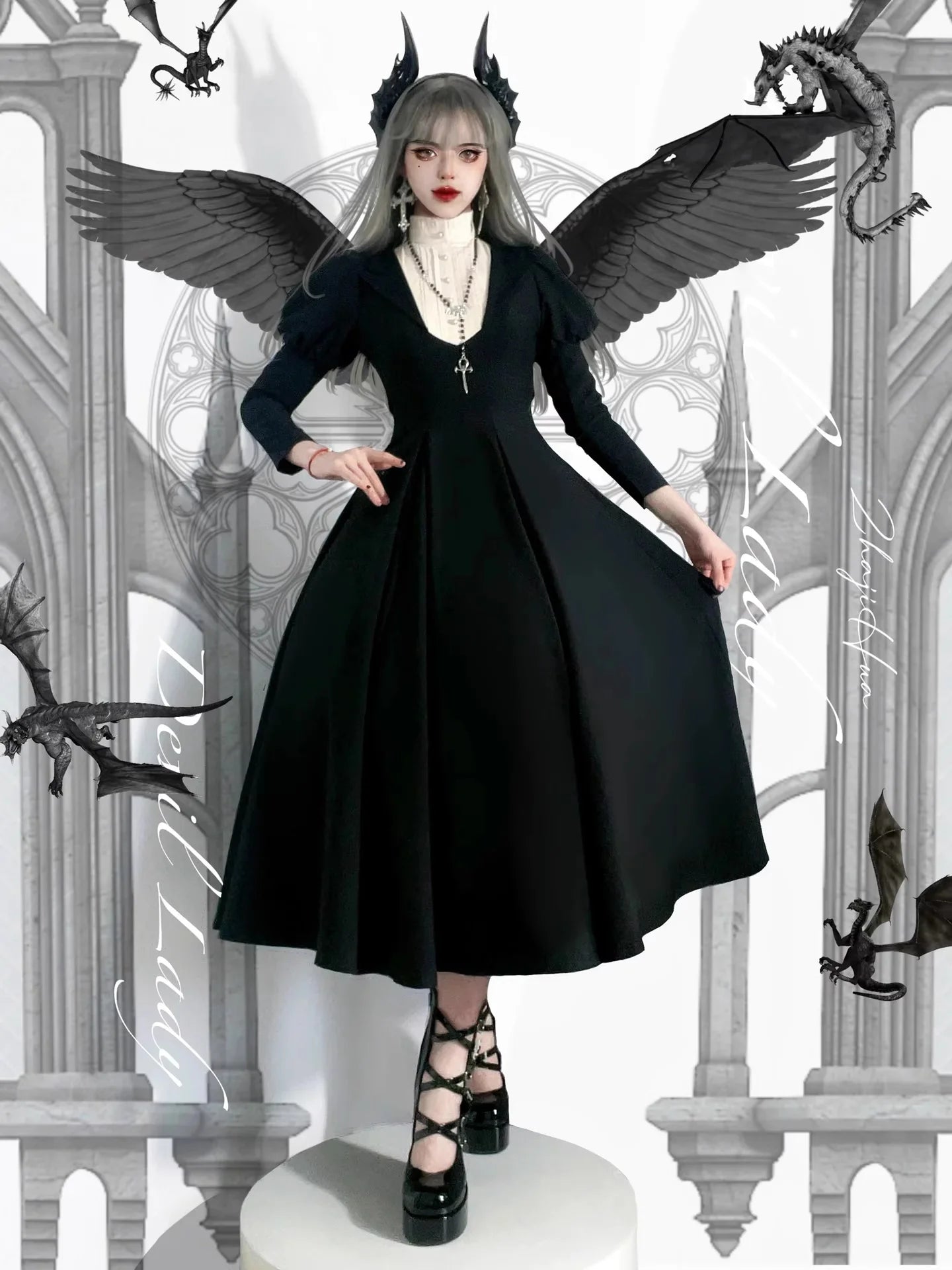 Coalfell Vintage Gothic Black Lolita Dress – Slim Fit, Long Sleeves, Puffy Large Hem, Autumn Elegance
