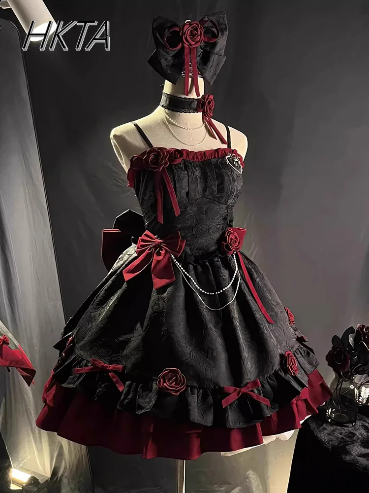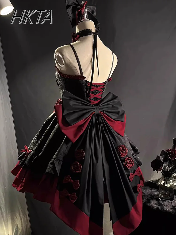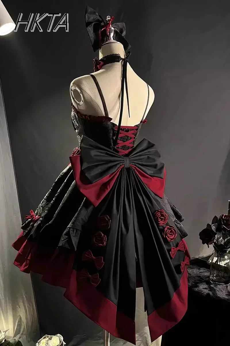 Embrace dramatic elegance with this Gothic Lolita Y2K JSK Dress — a stunning black and red masterpiece with romantic details, perfect for cosplay, birthdays, or living your dark princess dreams.