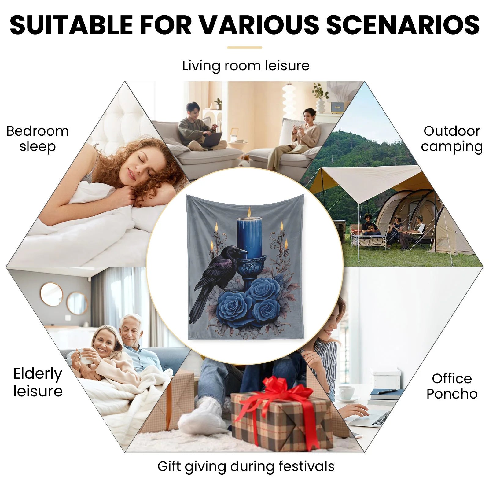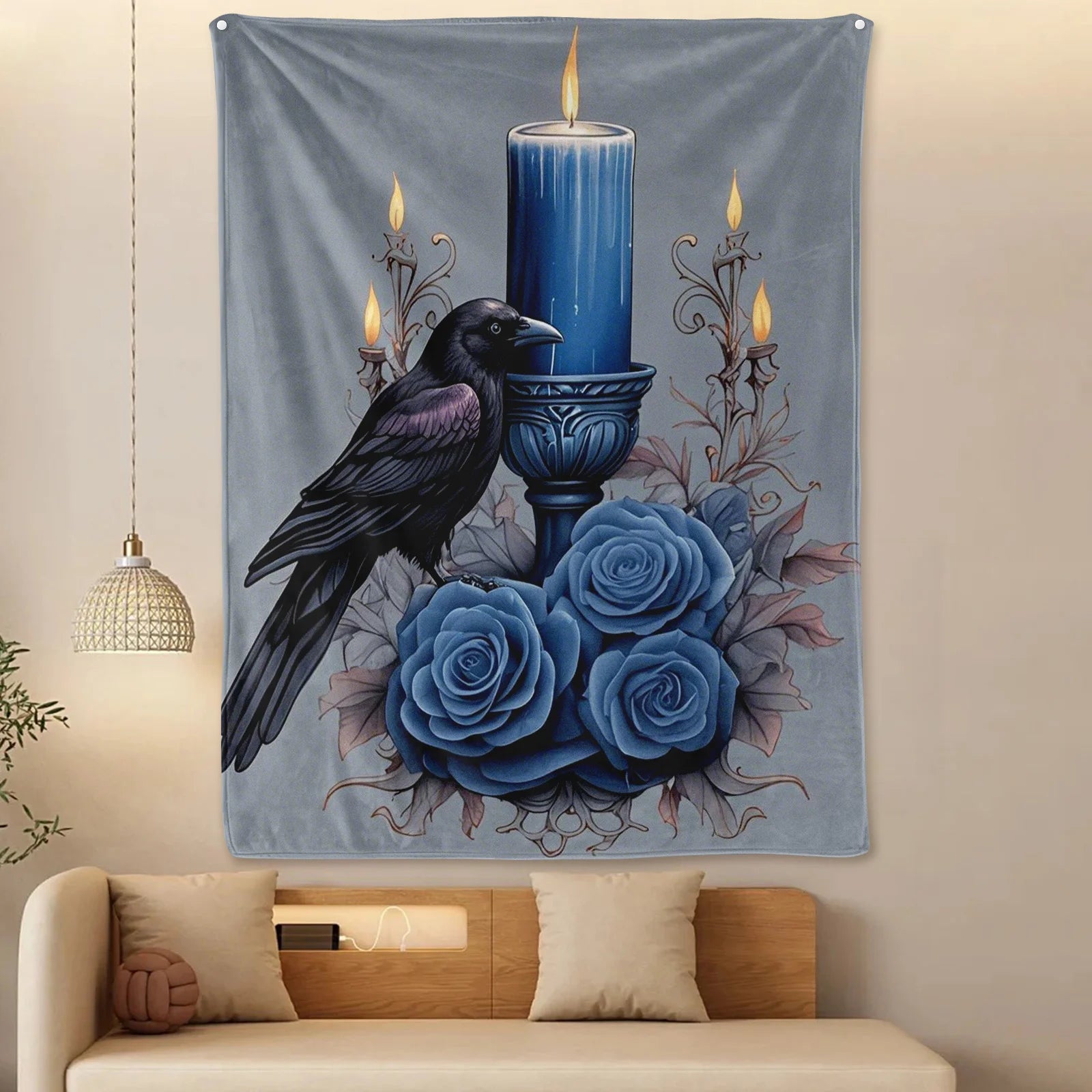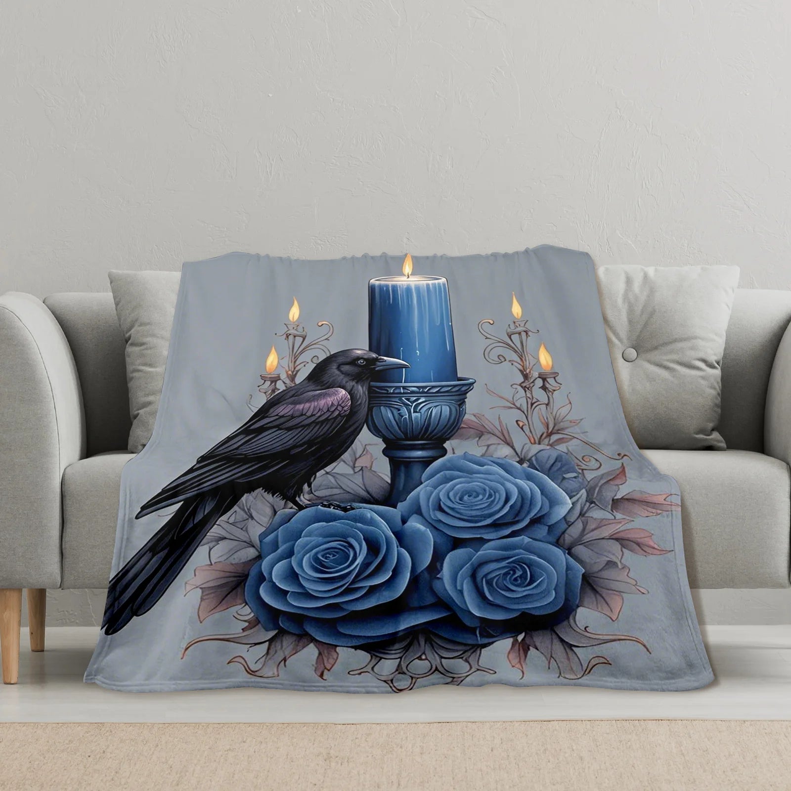 Gothic Raven with Candle and Blue Roses Blanket – Dark Aesthetic Home Decor & Unique Gift
