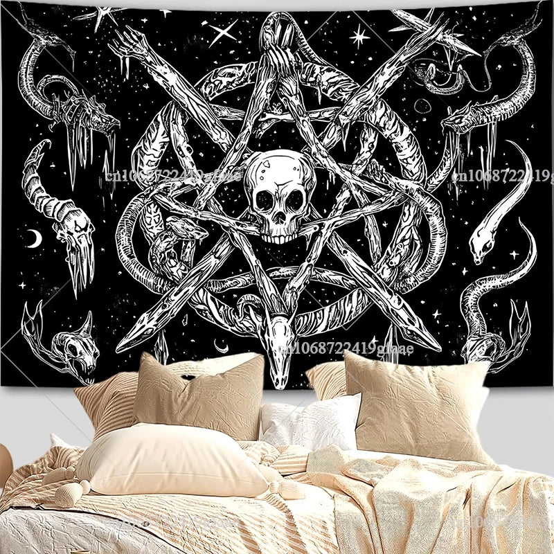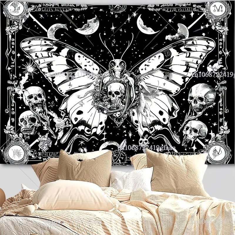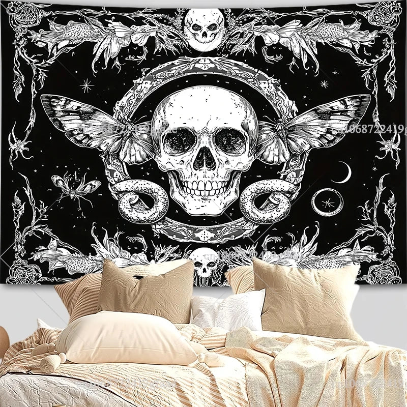 Elevate your space with dark elegance using this Gothic Skull Tapestry — featuring a bold black and white skeleton design perfect for room decor, Halloween aesthetics, or as a dramatic party backdrop.