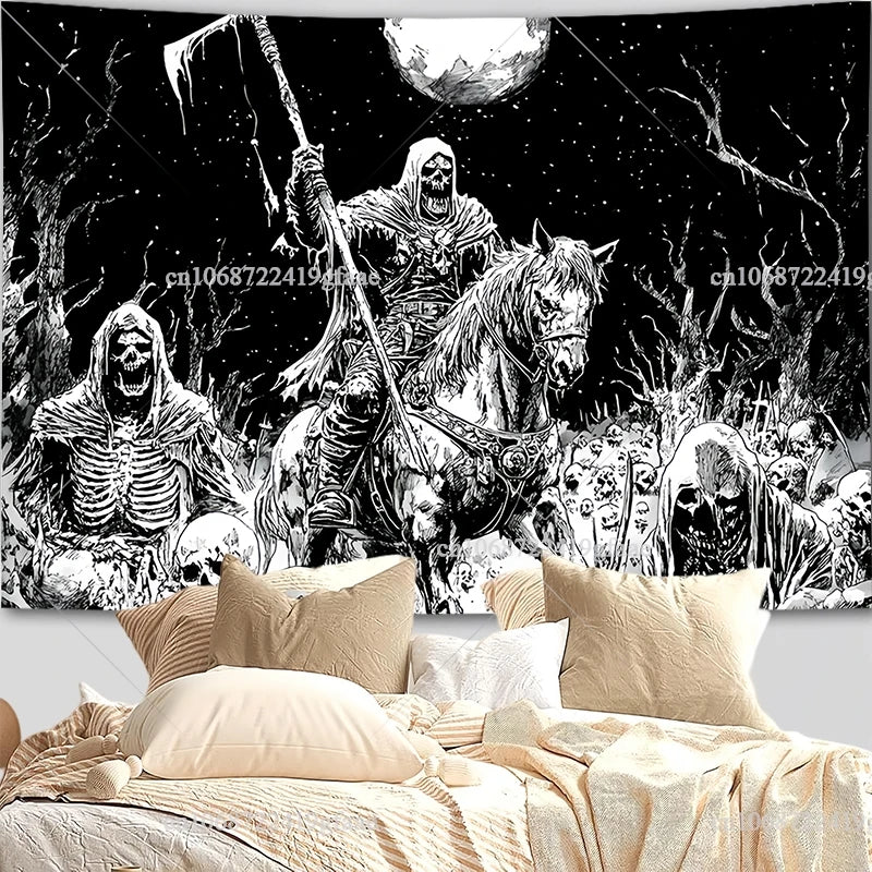 Gothic Skull Tapestry – Black & White Skeleton Wall Hanging for Halloween & Room Decor