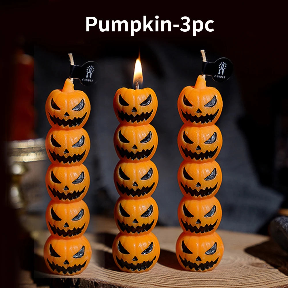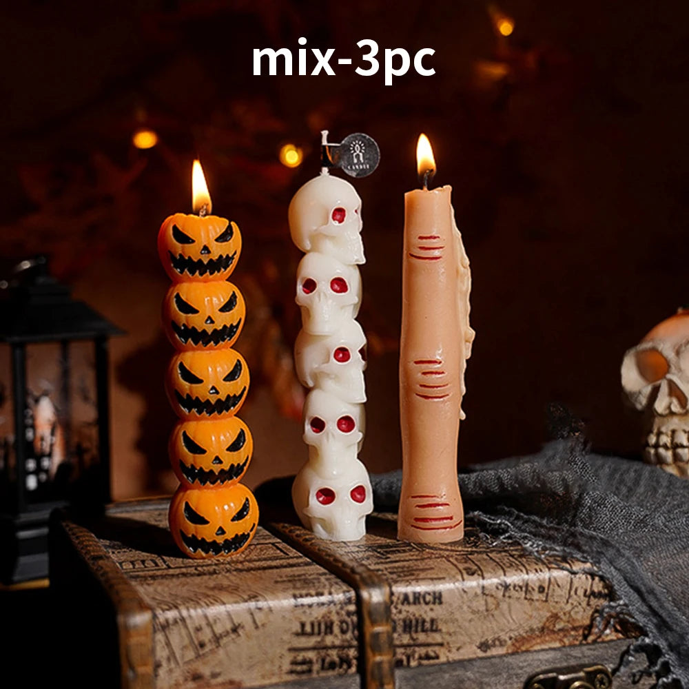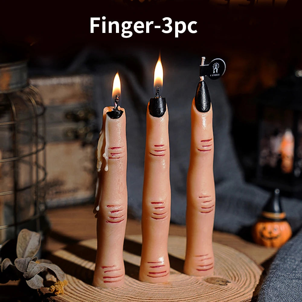Set includes uniquely shaped candles: pumpkin, skull, and finger designs