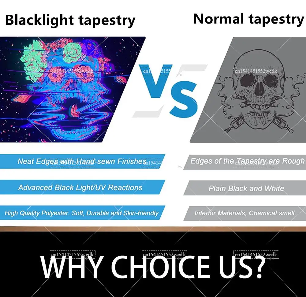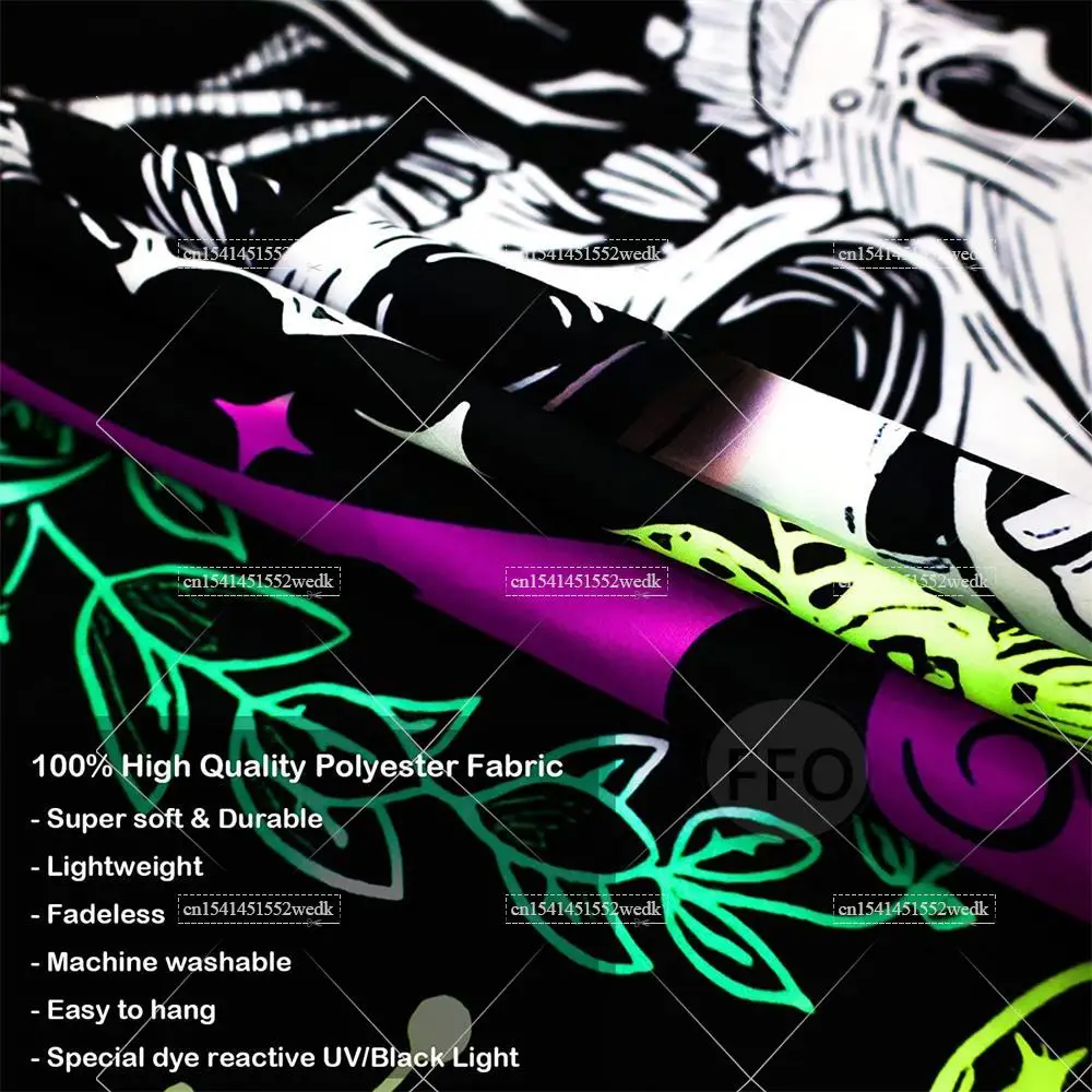 • UV reactive skull and psychedelic patterns designed for blacklight parties and ambient decor