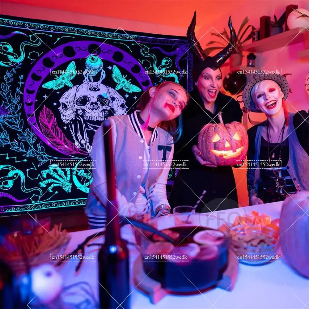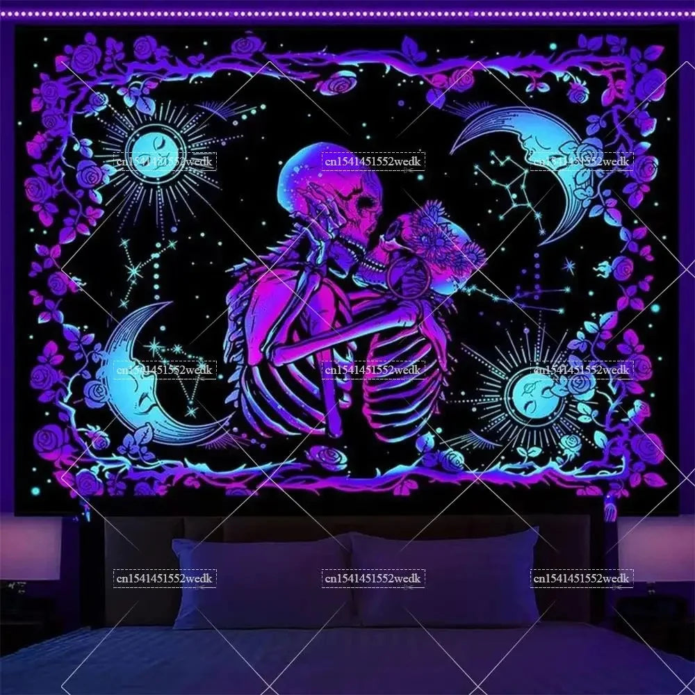 Hippie Skull Blacklight Tapestry – UV Reactive Neon Glow-In-The-Dark Halloween Skeleton Wall Hanging