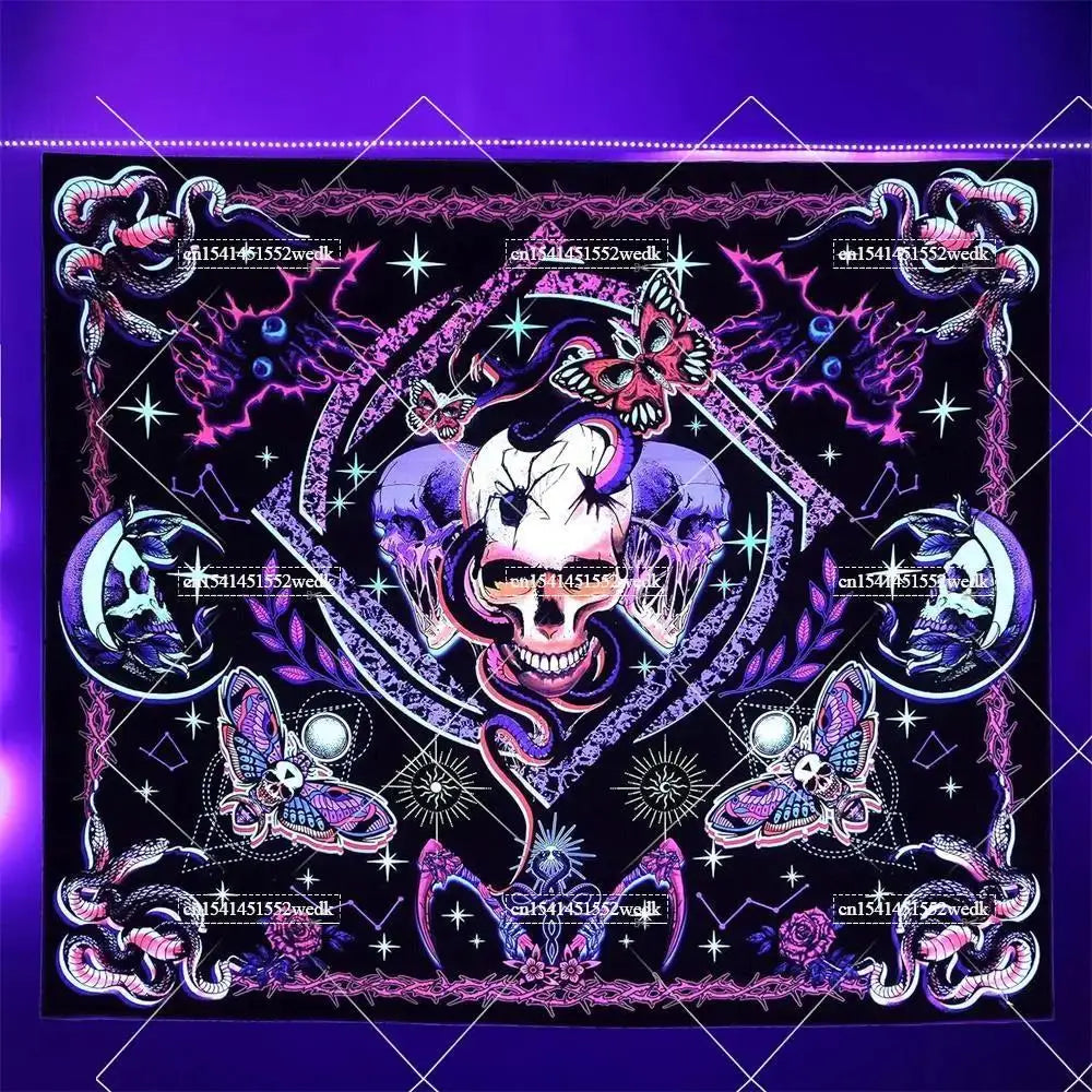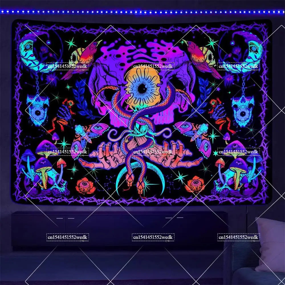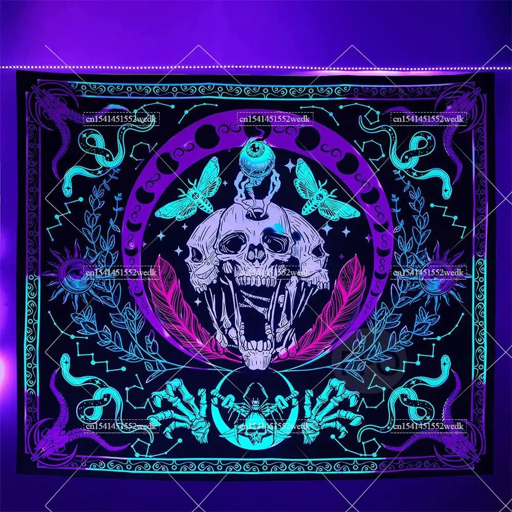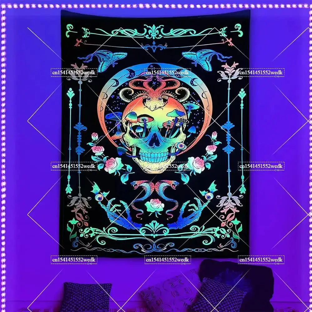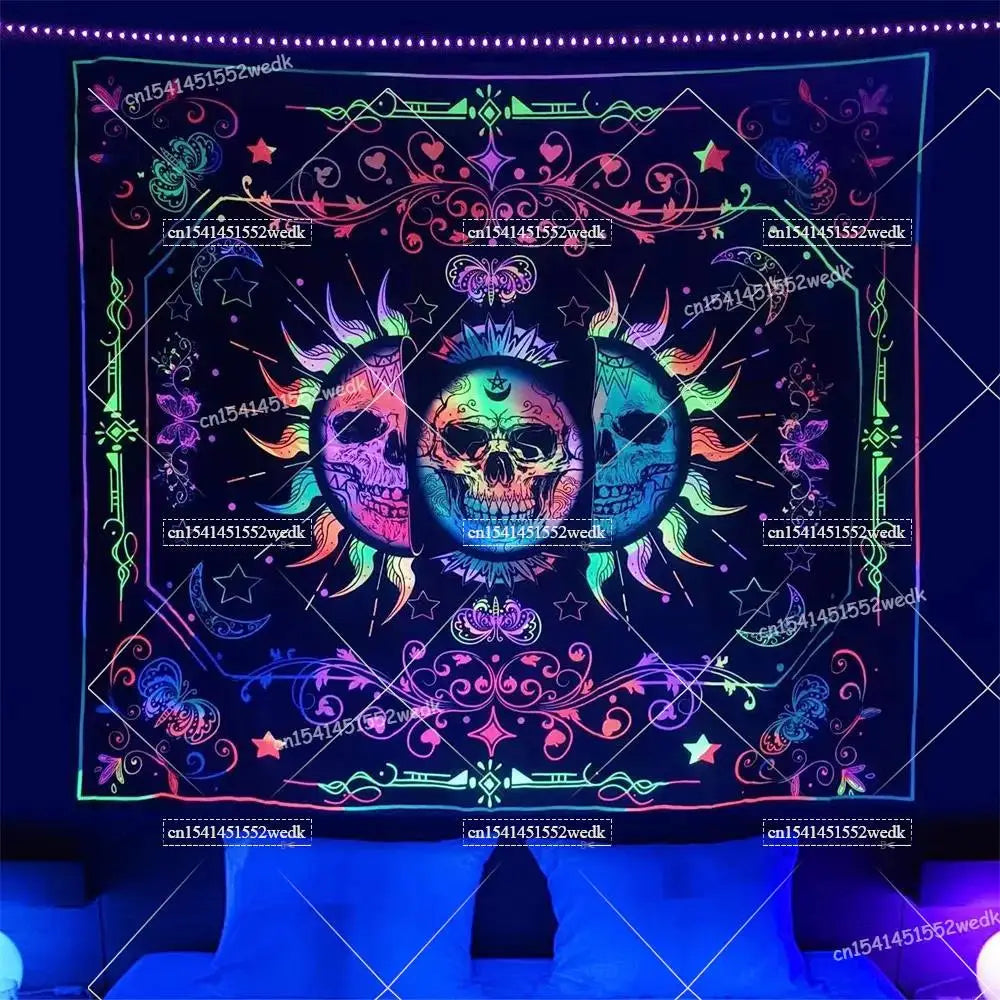 Illuminate your space with neon magic — get your Hippie Skull Blacklight Tapestry today and glow into the night!