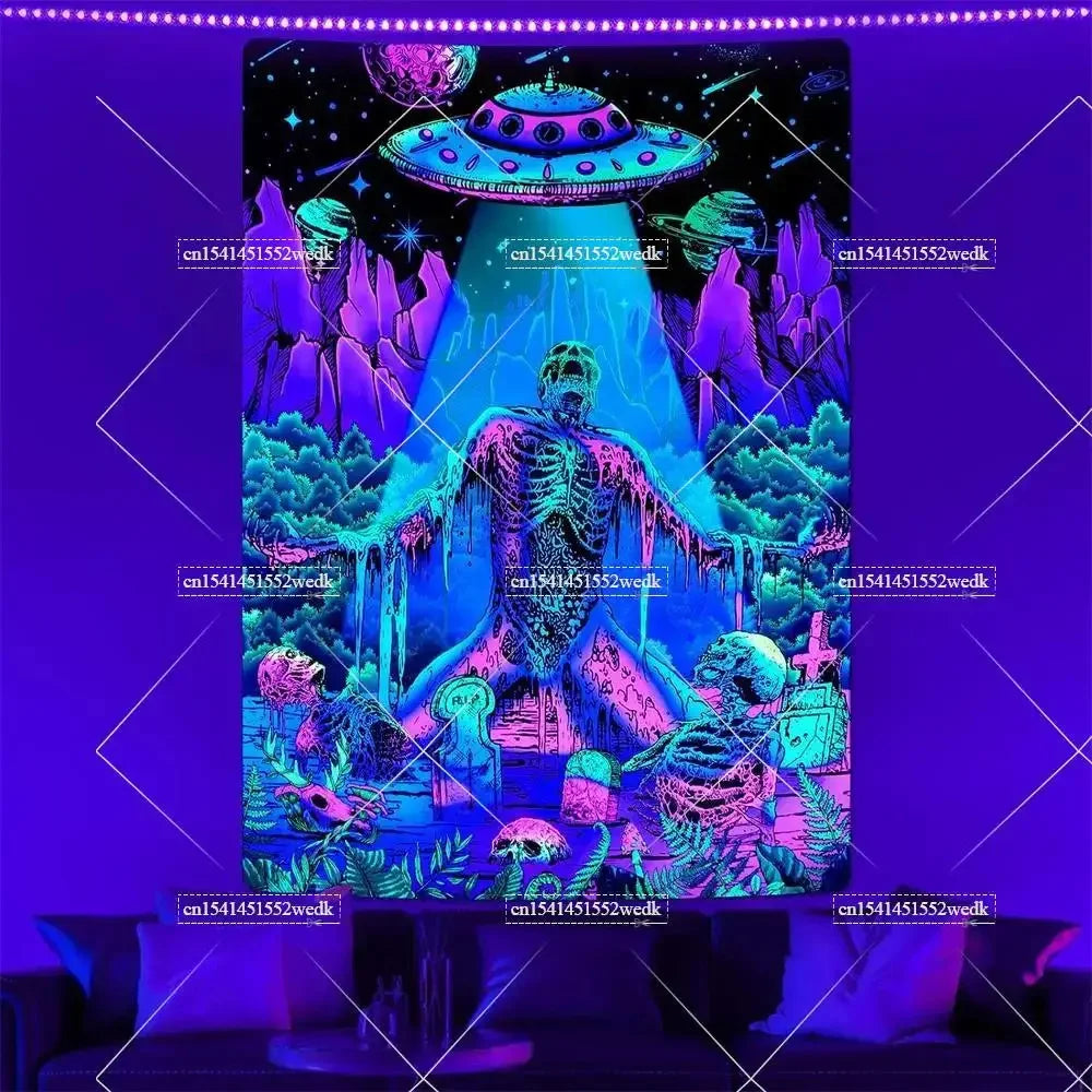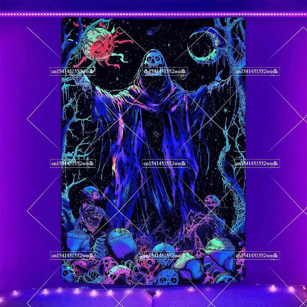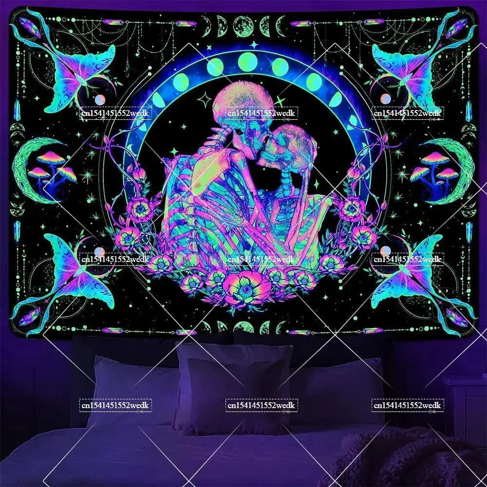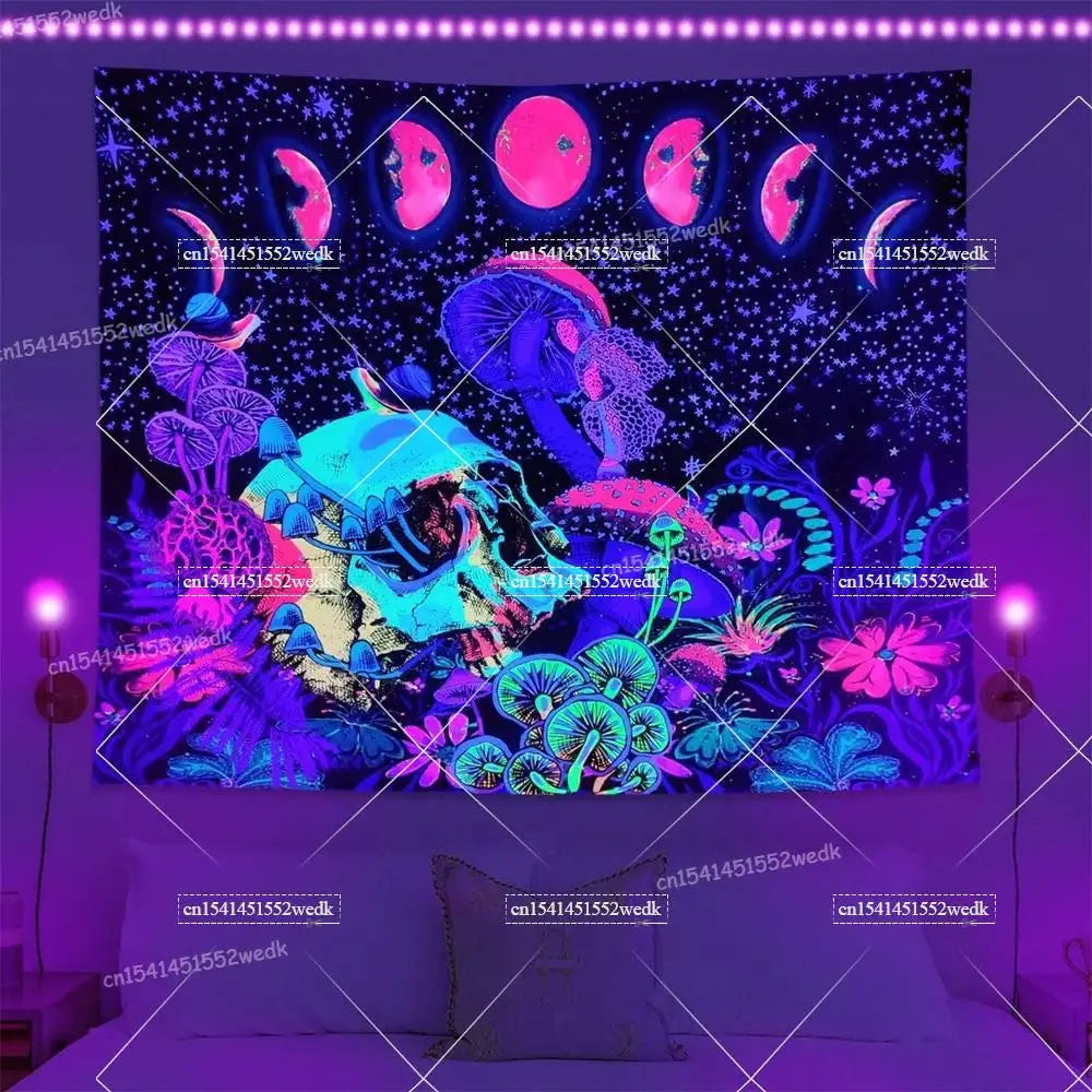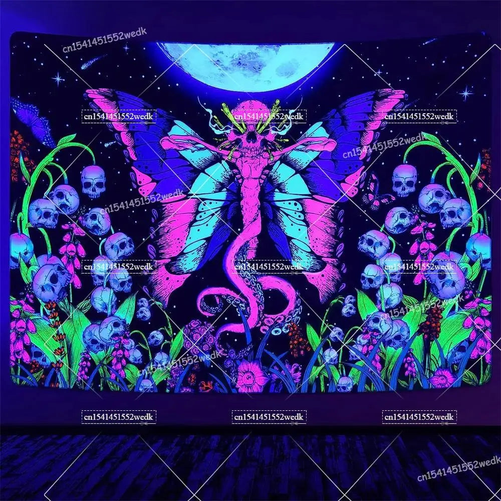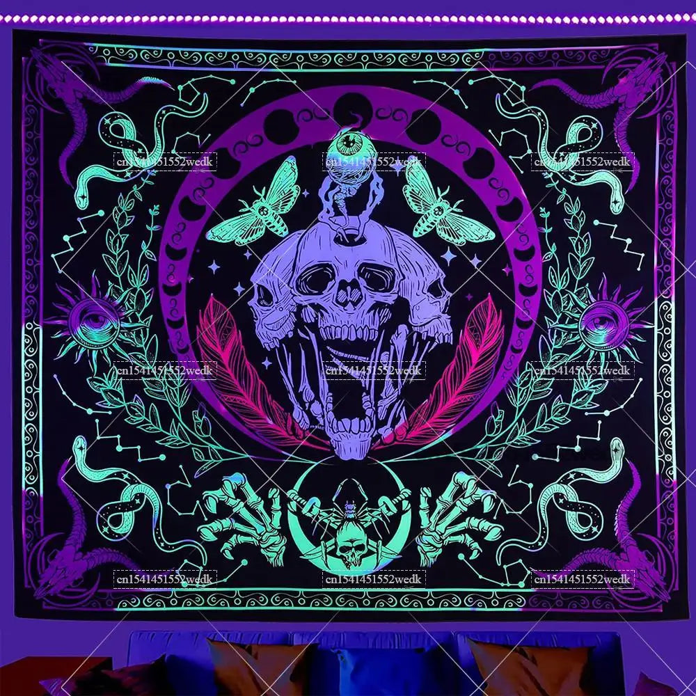 Illuminate your space with neon magic — get your Hippie Skull Blacklight Tapestry today and glow into the night!