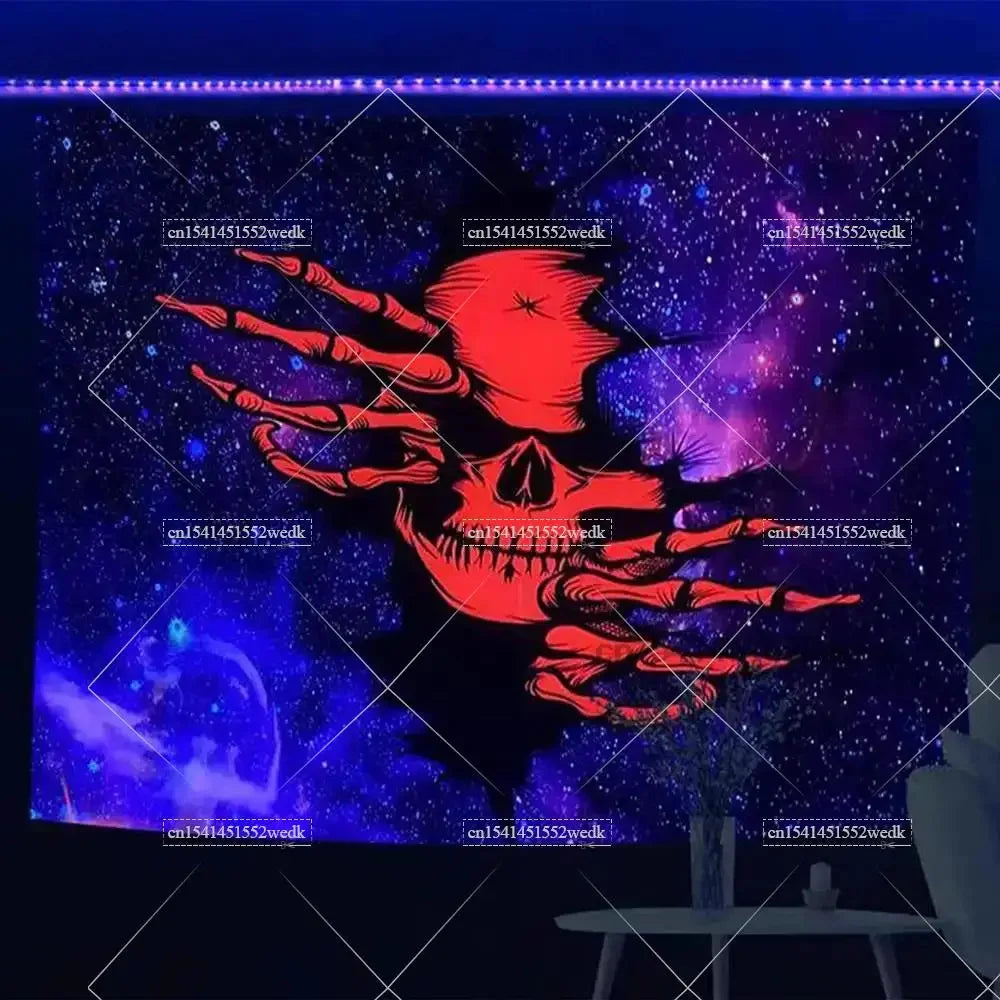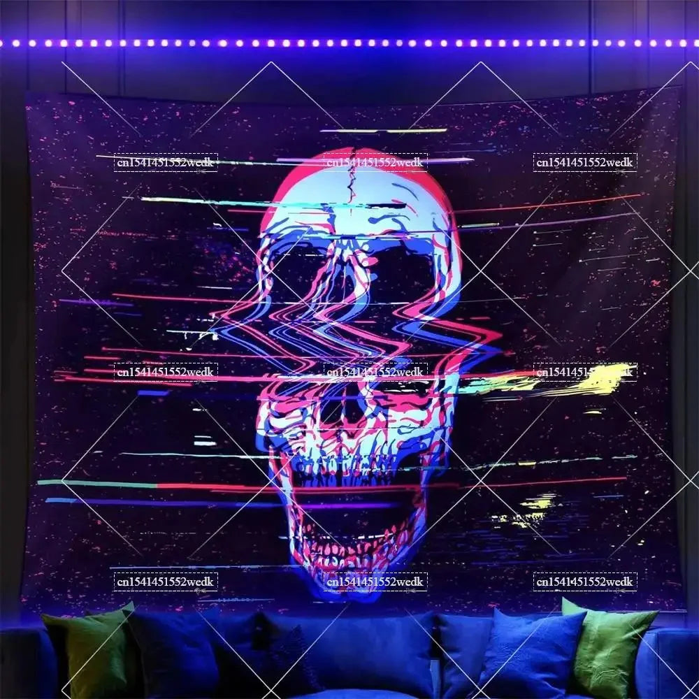 Light up your space with vibrant vibes using this Hippie Skull Blacklight Tapestry — a UV reactive, neon skeleton design that glows brilliantly under blacklight. Perfect for Halloween, parties, or adding an aesthetic edge to any room.
