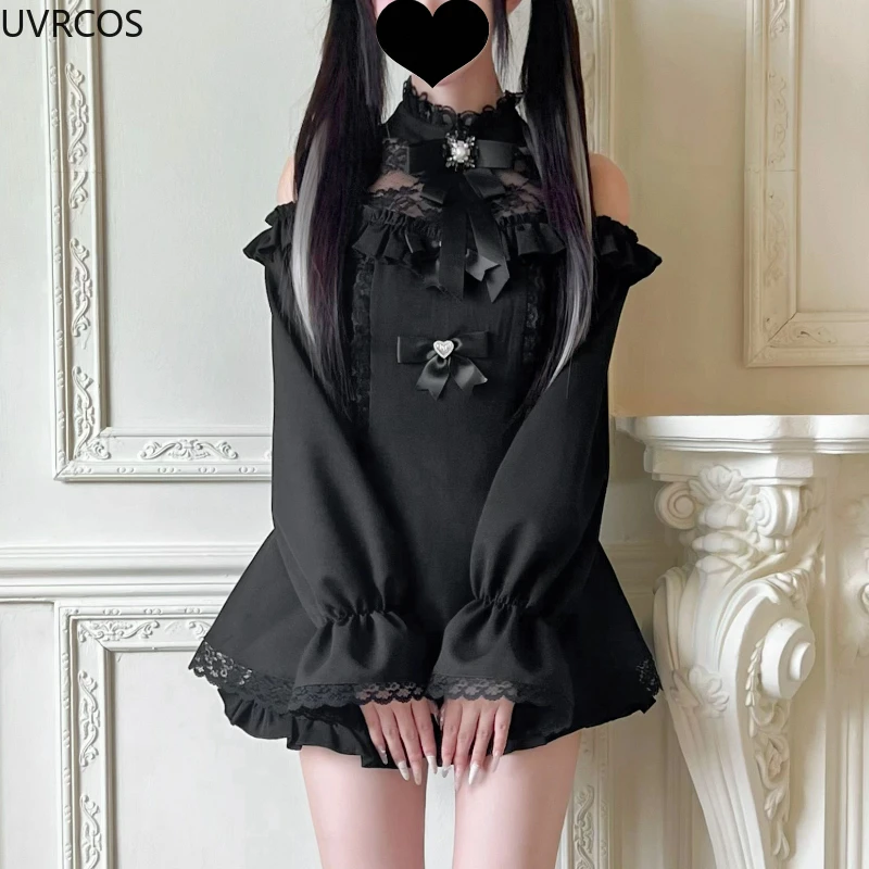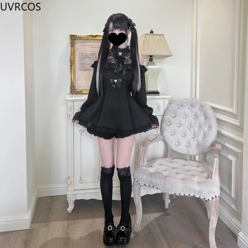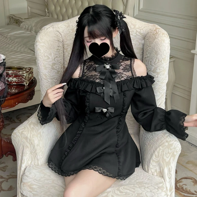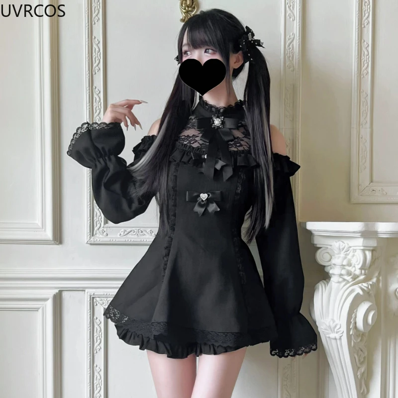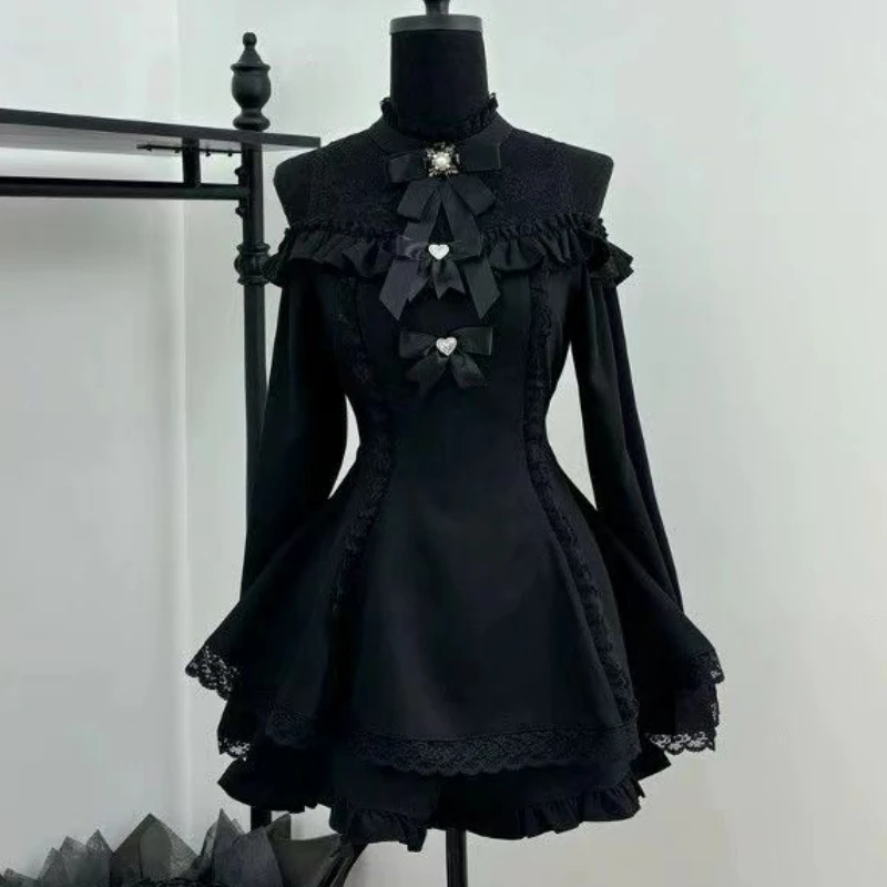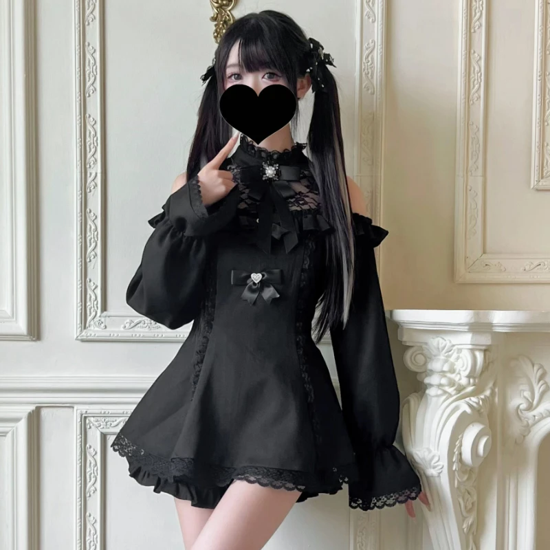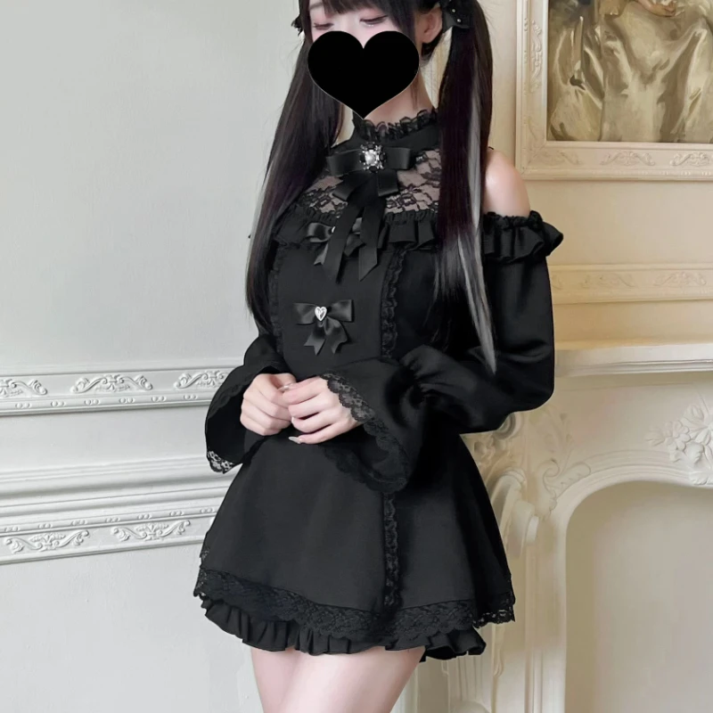 Japanese Gothic Rhinestone Bow Dress & Shorts Set – Lolita Y2K Off-Shoulder Outfit for Women