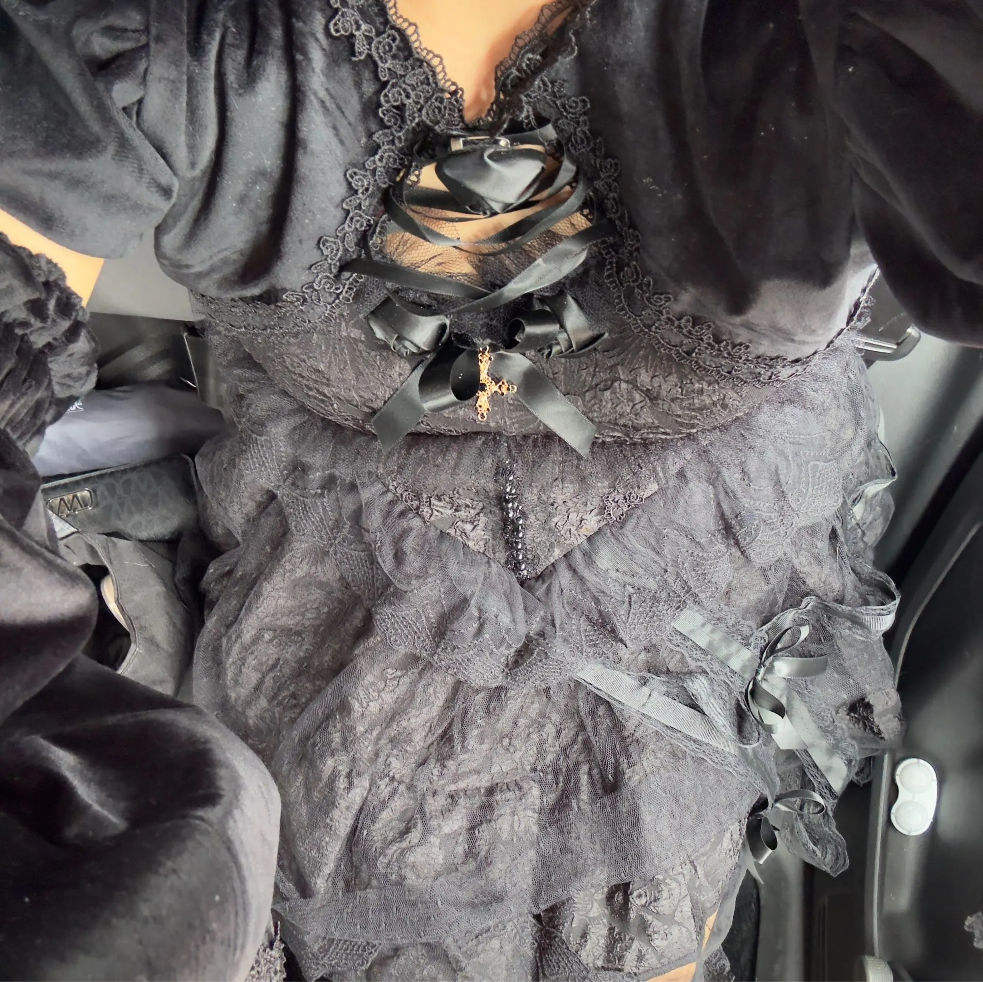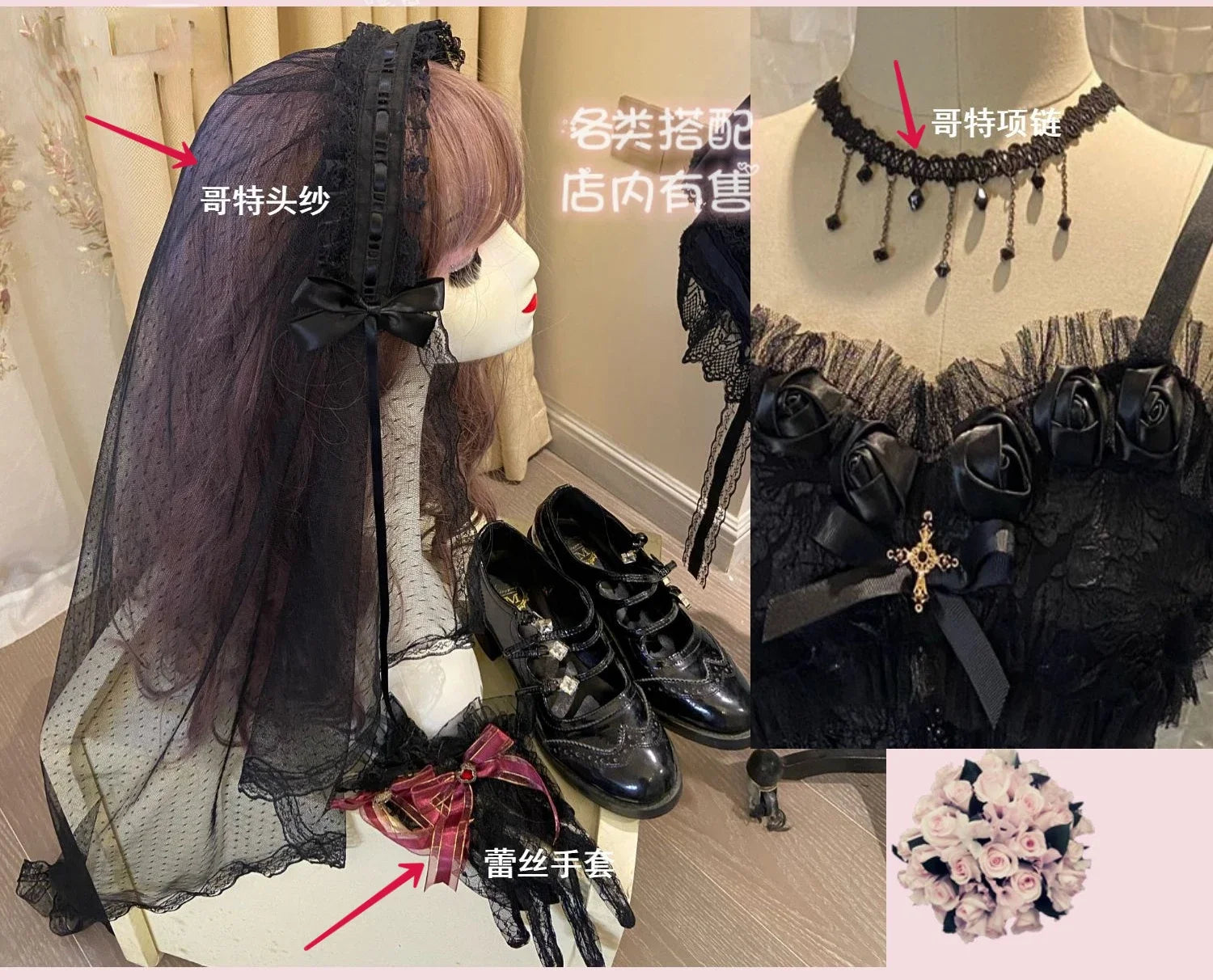 Step into a world of elegance and mystery with this Japanese Victorian Gothic Lolita Dress — a vintage-inspired slip dress adorned with delicate lace and rose details, perfect for holiday parties, cosplay, or dark romantic occasions.