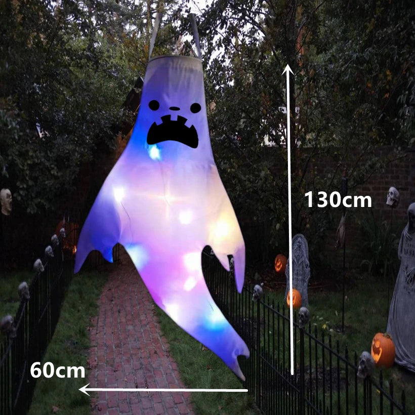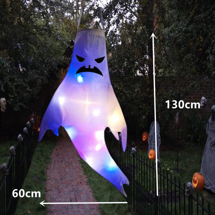 Create a haunting atmosphere with this large LED hanging ghost — a glowing Halloween decoration perfect for outdoor setups, parties, and spooky home accents!